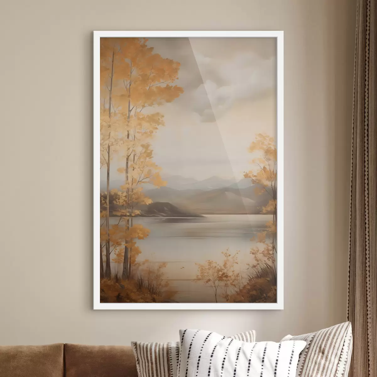 Poster Herfstbomen met oranje bladeren omlijsten een rustig meer met bergen in de verte onder een bewolkte hemel. f47441