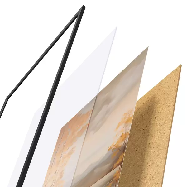 De poster bestaat uit een frame, plexiglas, geprinte afbeelding en spaanplaat achterkant. De poster kan meteen aan de muur worden gehangen dankzij de bevestigingen op de achterkant.