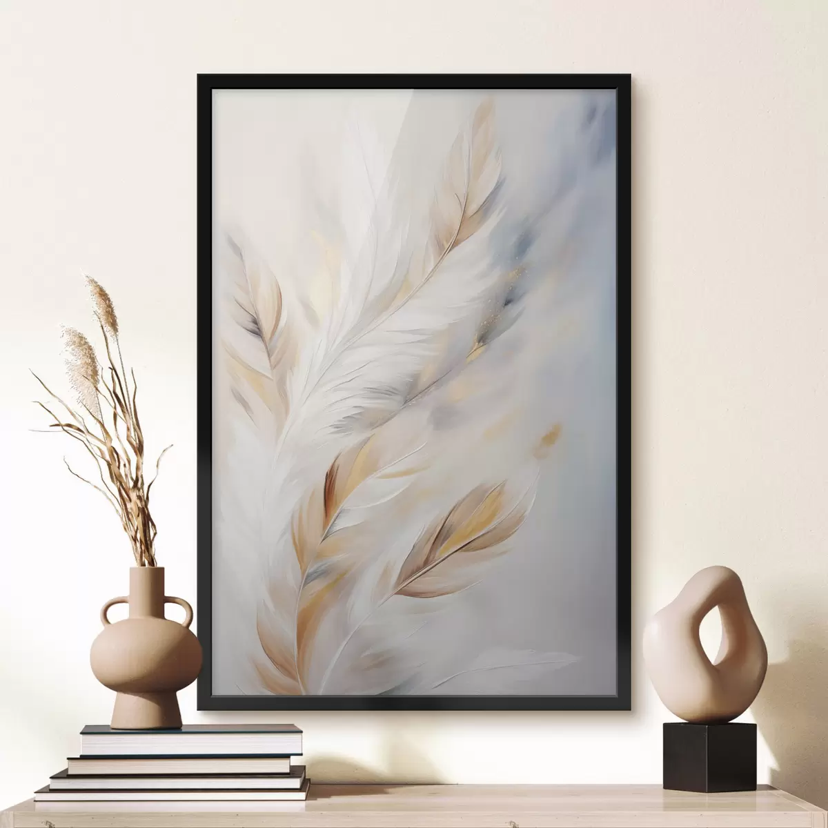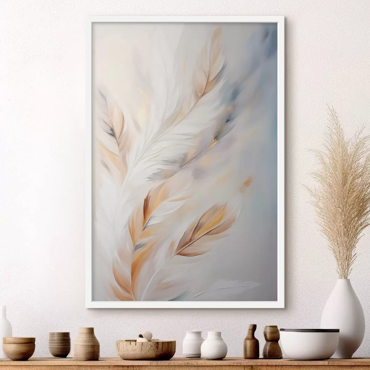 Poster Grote, zachte veren met een mix van witte, gele en bruine tinten, tegen een lichte, abstracte achtergrond. f47443