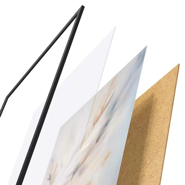 De poster bestaat uit een frame, plexiglas, geprinte afbeelding en spaanplaat achterkant. De poster kan meteen aan de muur worden gehangen dankzij de bevestigingen op de achterkant.