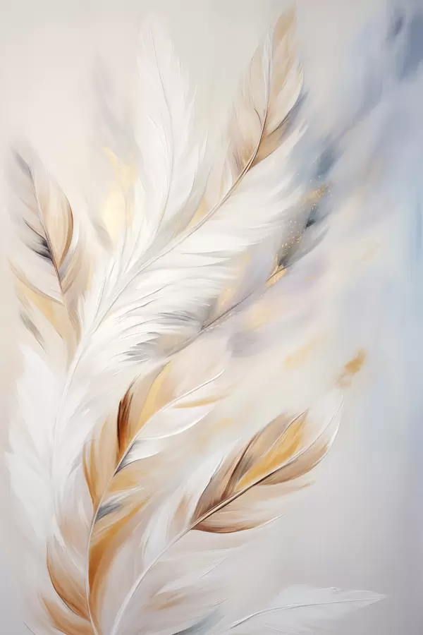 Poster Grote, zachte veren met een mix van witte, gele en bruine tinten, tegen een lichte, abstracte achtergrond. f47443