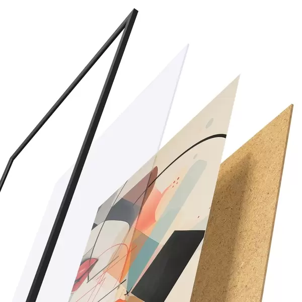 De poster bestaat uit een frame, plexiglas, geprinte afbeelding en spaanplaat achterkant. De poster kan meteen aan de muur worden gehangen dankzij de bevestigingen op de achterkant.