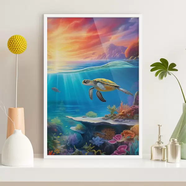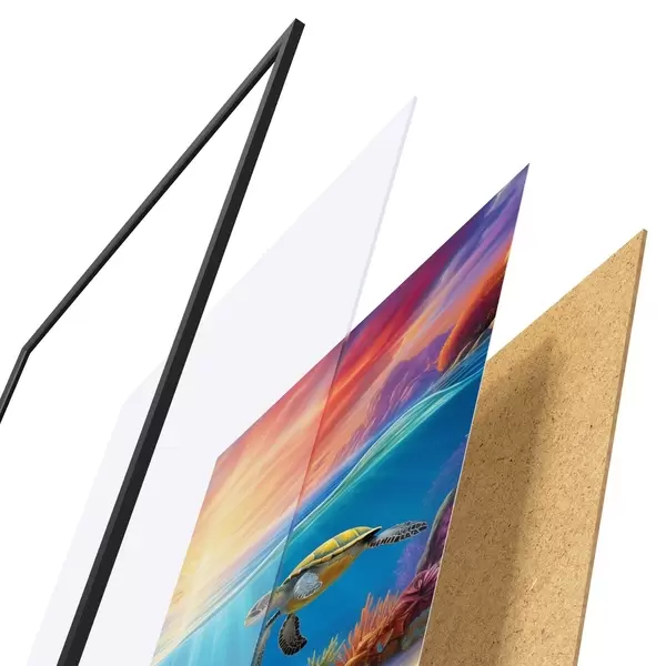 De poster bestaat uit een frame, plexiglas, geprinte afbeelding en spaanplaat achterkant. De poster kan meteen aan de muur worden gehangen dankzij de bevestigingen op de achterkant.