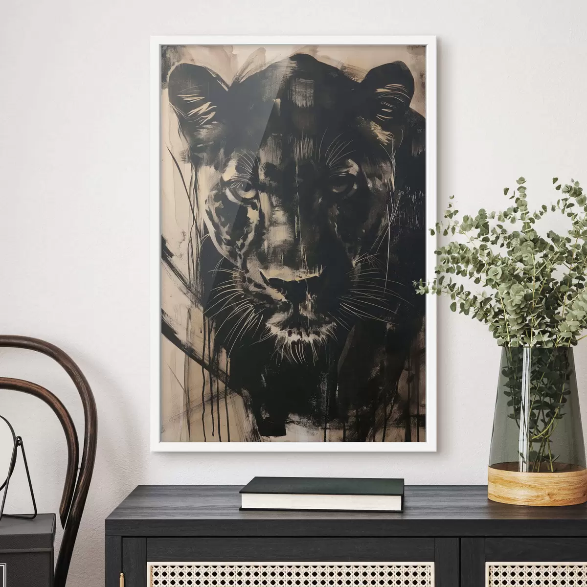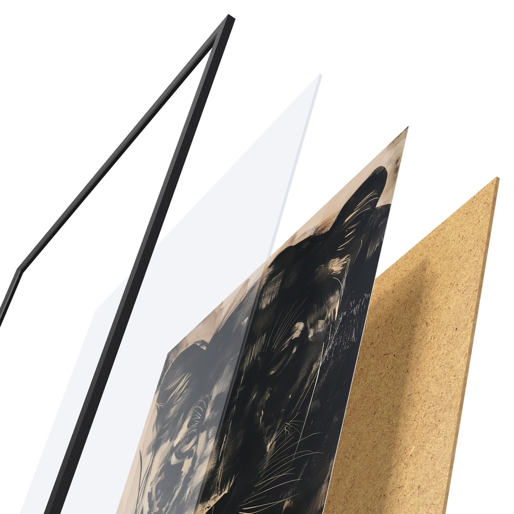 De poster bestaat uit een frame, plexiglas, geprinte afbeelding en spaanplaat achterkant. De poster kan meteen aan de muur worden gehangen dankzij de bevestigingen op de achterkant.