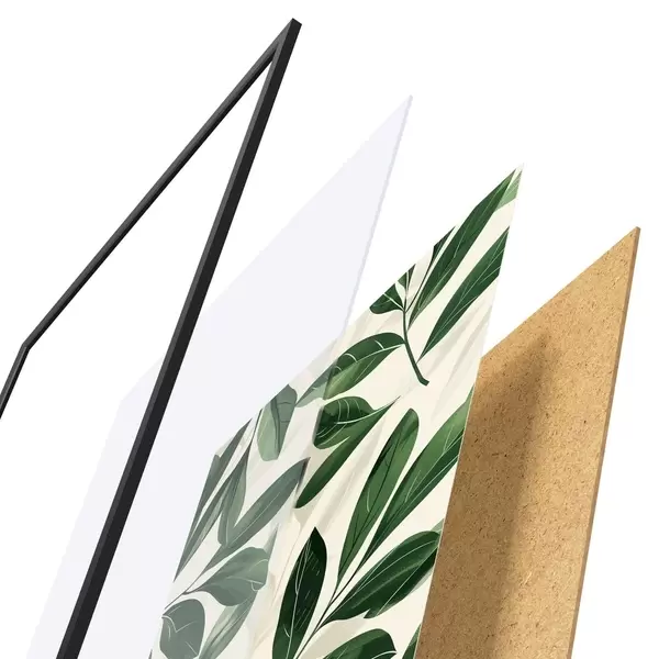 De poster bestaat uit een frame, plexiglas, geprinte afbeelding en spaanplaat achterkant. De poster kan meteen aan de muur worden gehangen dankzij de bevestigingen op de achterkant.