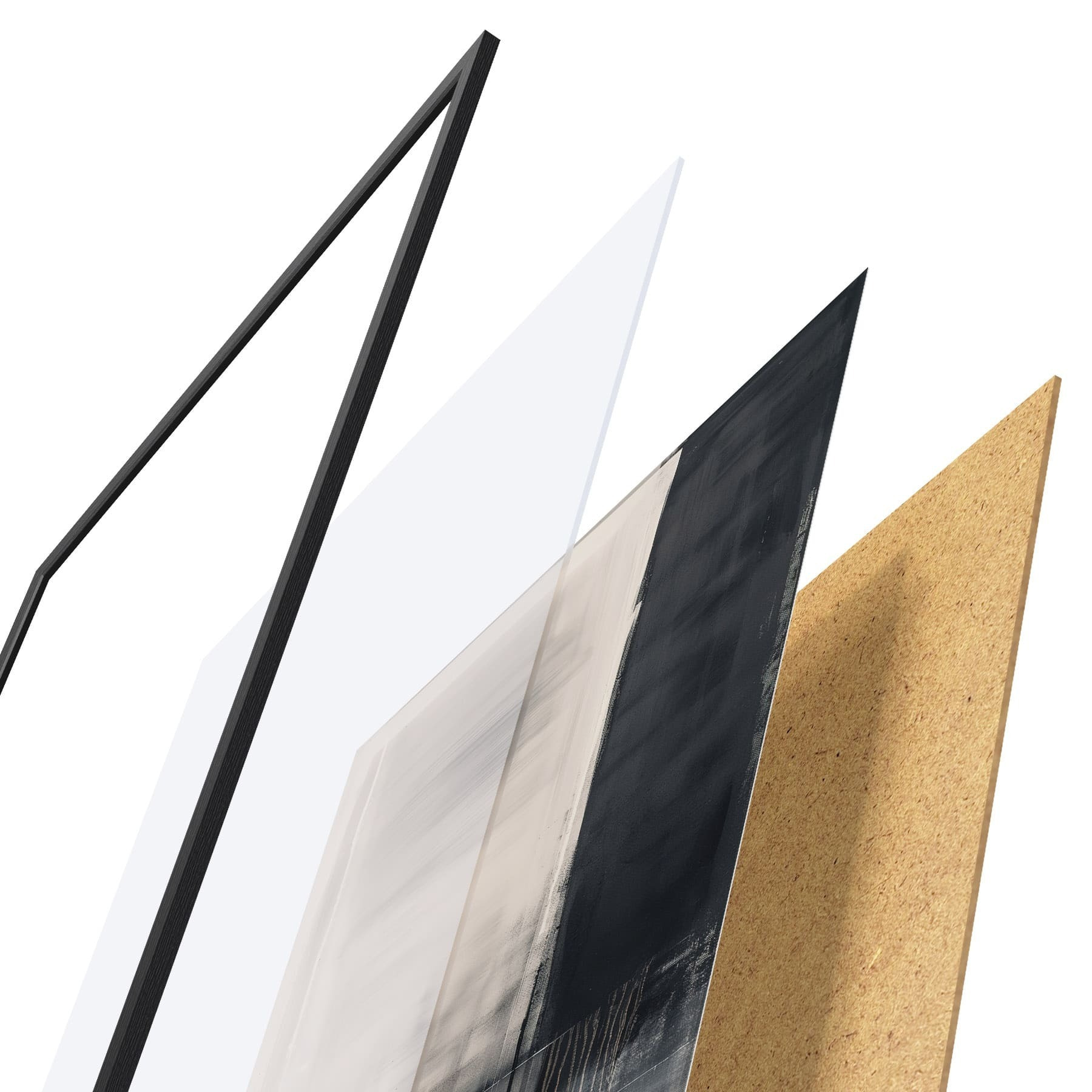 De poster bestaat uit een frame, plexiglas, geprinte afbeelding en spaanplaat achterkant. De poster kan meteen aan de muur worden gehangen dankzij de bevestigingen op de achterkant.