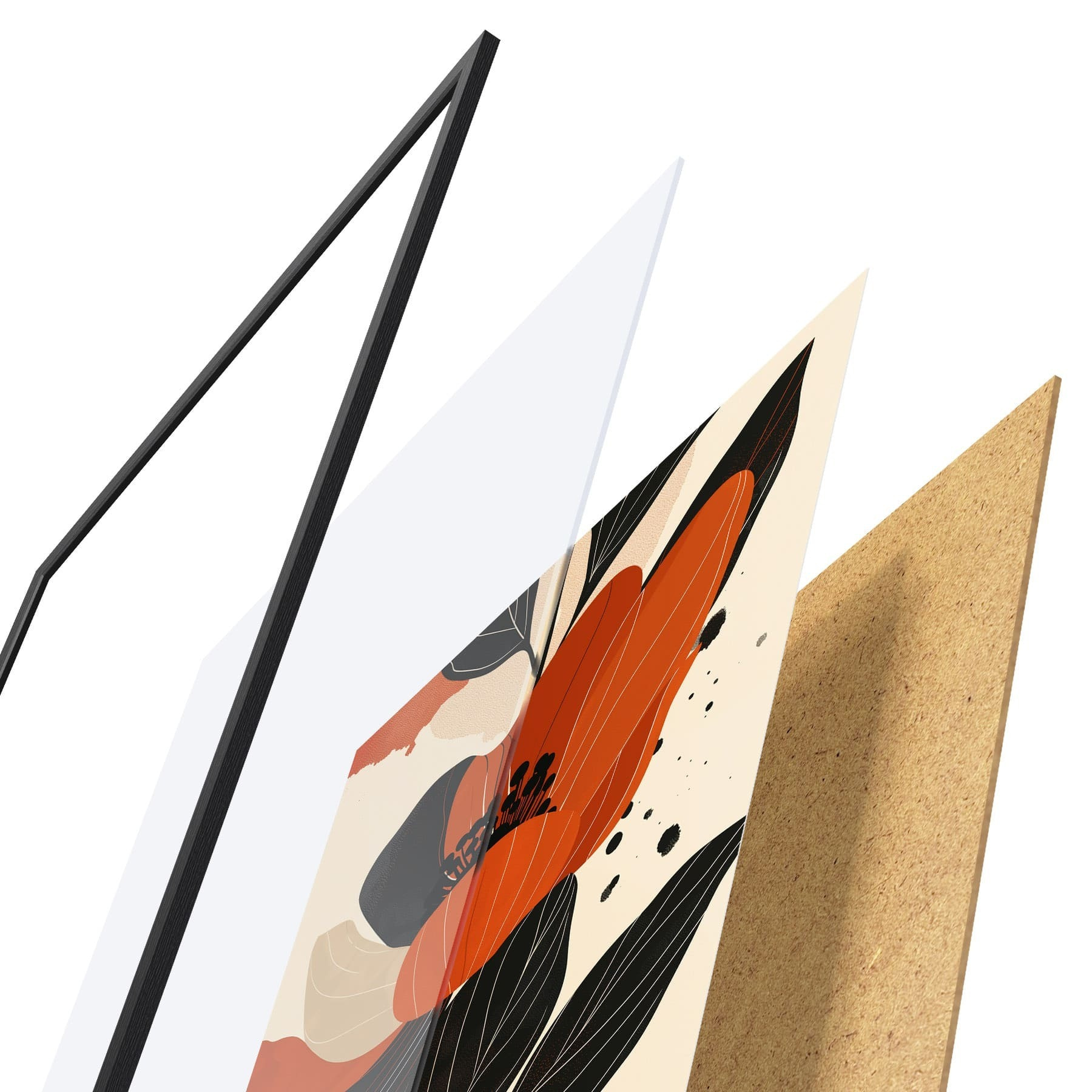 De poster bestaat uit een frame, plexiglas, geprinte afbeelding en spaanplaat achterkant. De poster kan meteen aan de muur worden gehangen dankzij de bevestigingen op de achterkant.