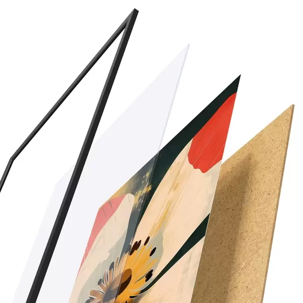 De poster bestaat uit een frame, plexiglas, geprinte afbeelding en spaanplaat achterkant. De poster kan meteen aan de muur worden gehangen dankzij de bevestigingen op de achterkant.