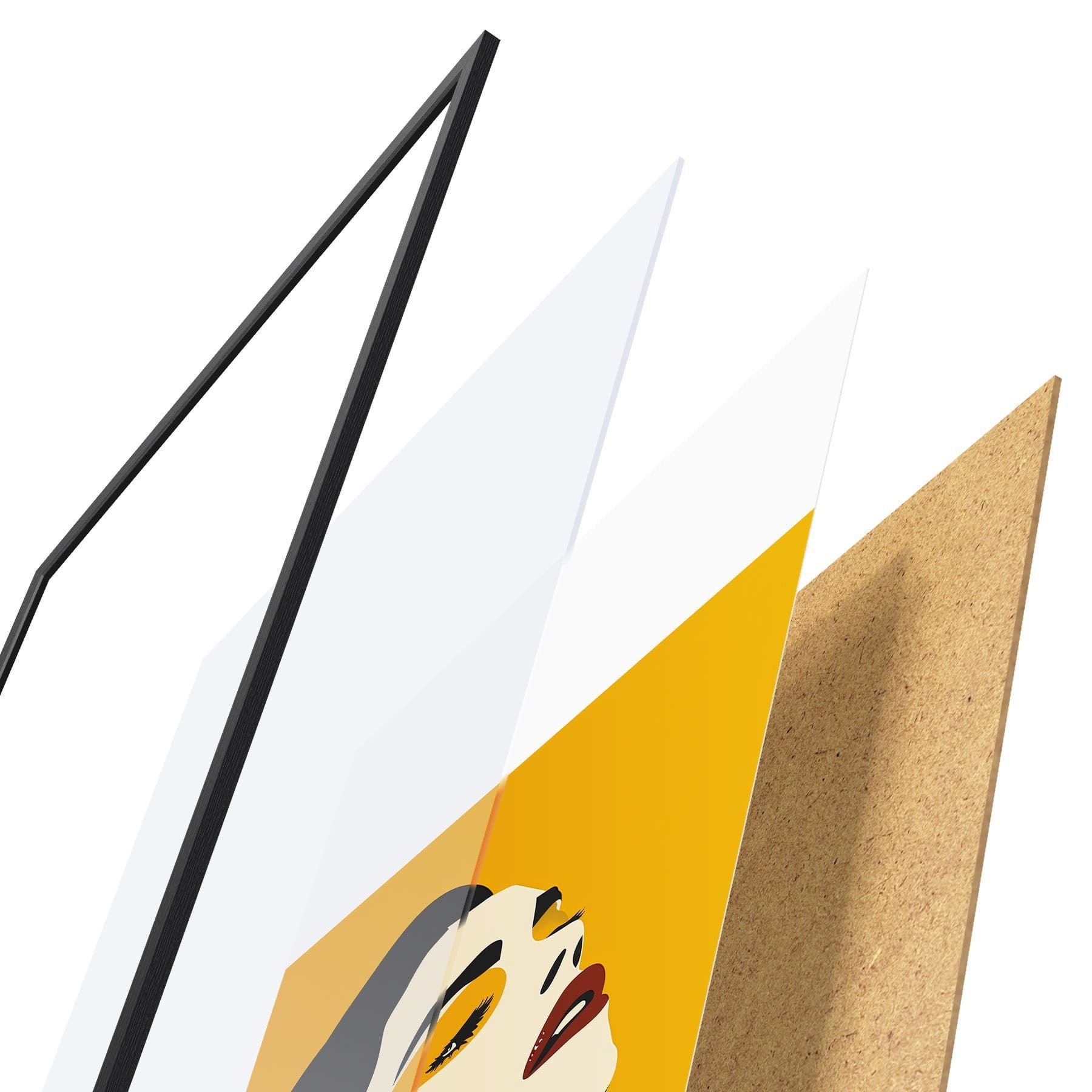 De poster bestaat uit een frame, plexiglas, geprinte afbeelding en spaanplaat achterkant. De poster kan meteen aan de muur worden gehangen dankzij de bevestigingen op de achterkant.
