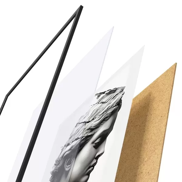 De poster bestaat uit een frame, plexiglas, geprinte afbeelding en spaanplaat achterkant. De poster kan meteen aan de muur worden gehangen dankzij de bevestigingen op de achterkant.