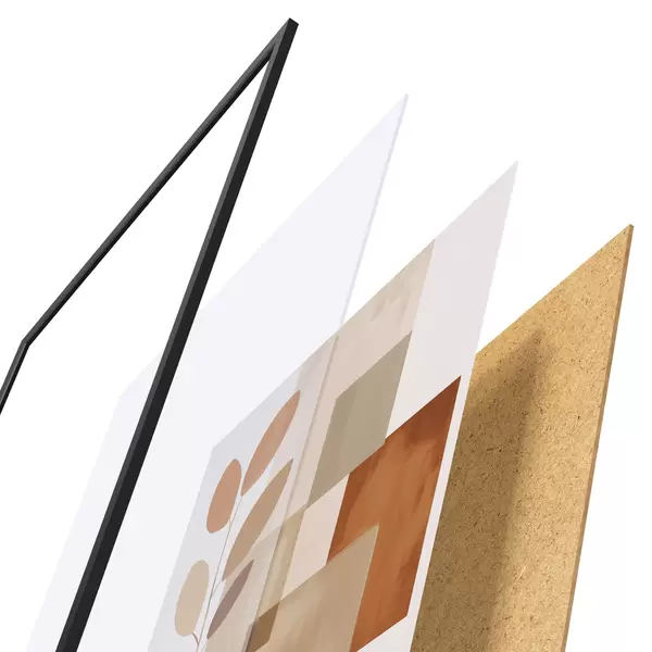 De poster bestaat uit een frame, plexiglas, geprinte afbeelding en spaanplaat achterkant. De poster kan meteen aan de muur worden gehangen dankzij de bevestigingen op de achterkant.
