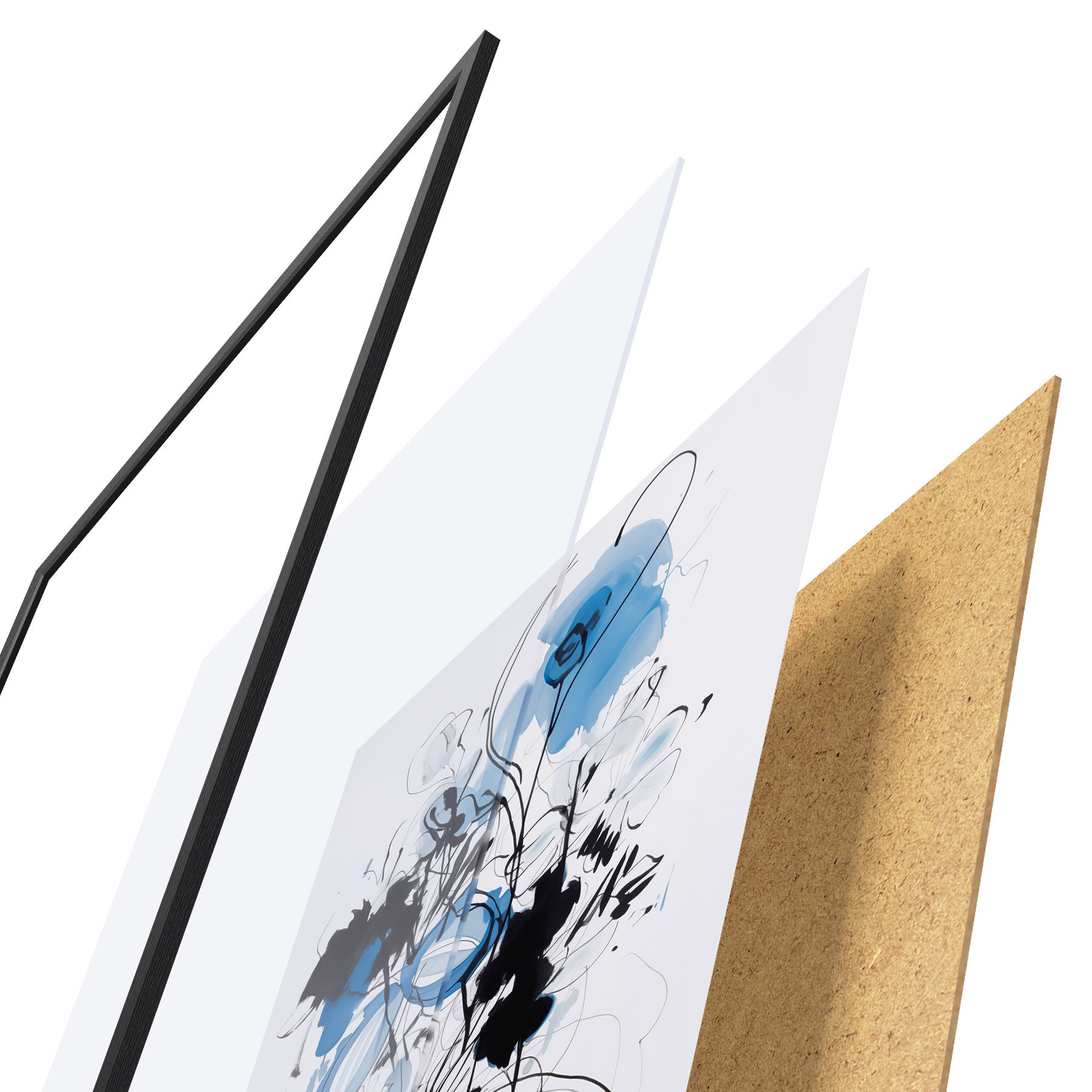 De poster bestaat uit een frame, plexiglas, geprinte afbeelding en spaanplaat achterkant. De poster kan meteen aan de muur worden gehangen dankzij de bevestigingen op de achterkant.