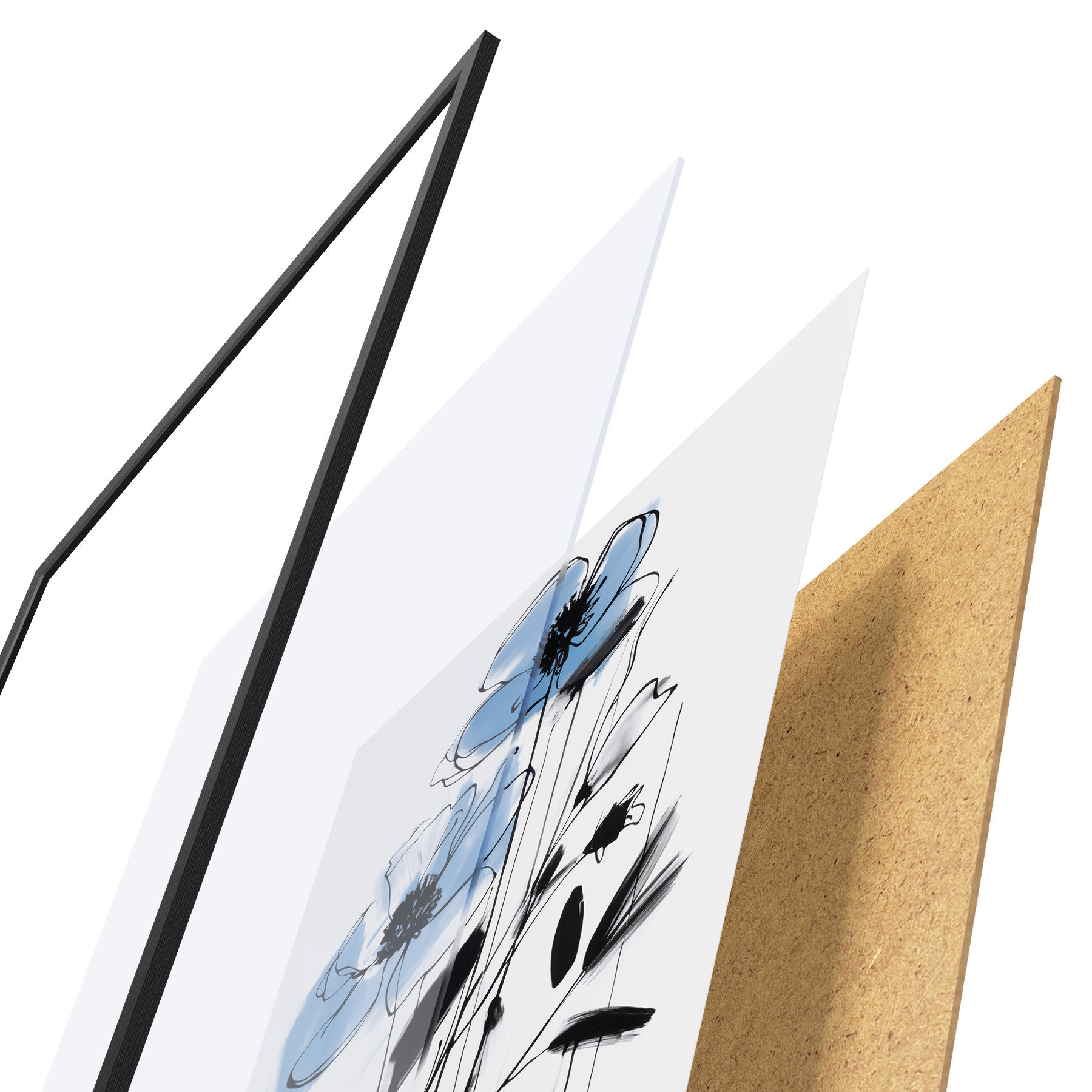 De poster bestaat uit een frame, plexiglas, geprinte afbeelding en spaanplaat achterkant. De poster kan meteen aan de muur worden gehangen dankzij de bevestigingen op de achterkant.