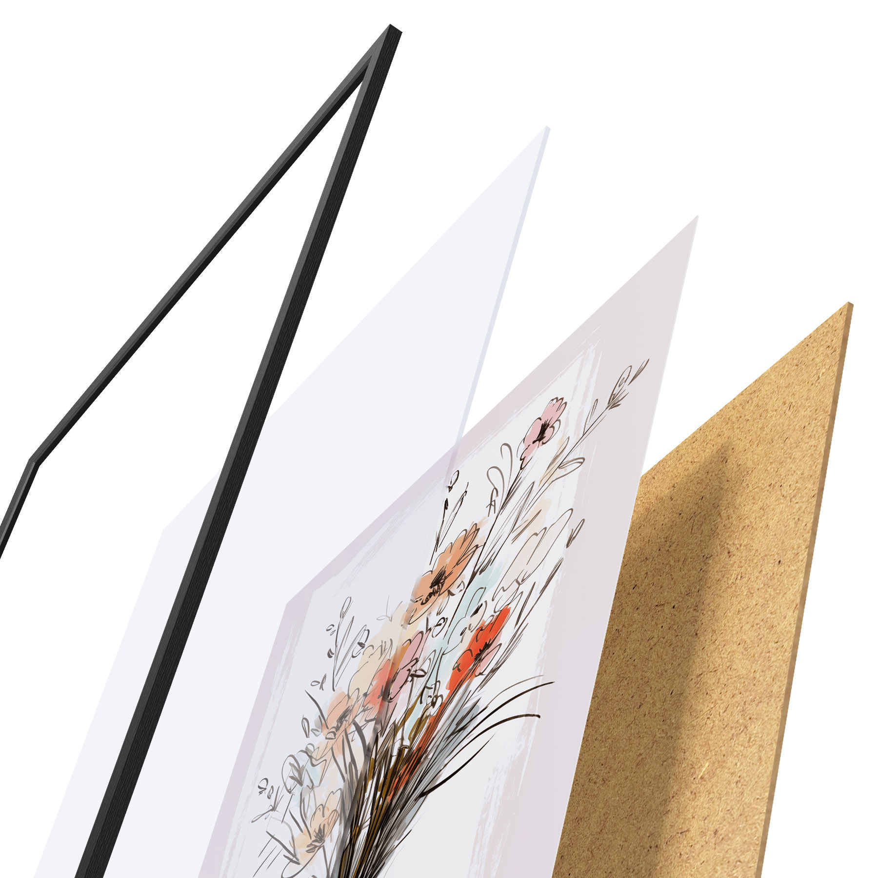 De poster bestaat uit een frame, plexiglas, geprinte afbeelding en spaanplaat achterkant. De poster kan meteen aan de muur worden gehangen dankzij de bevestigingen op de achterkant.