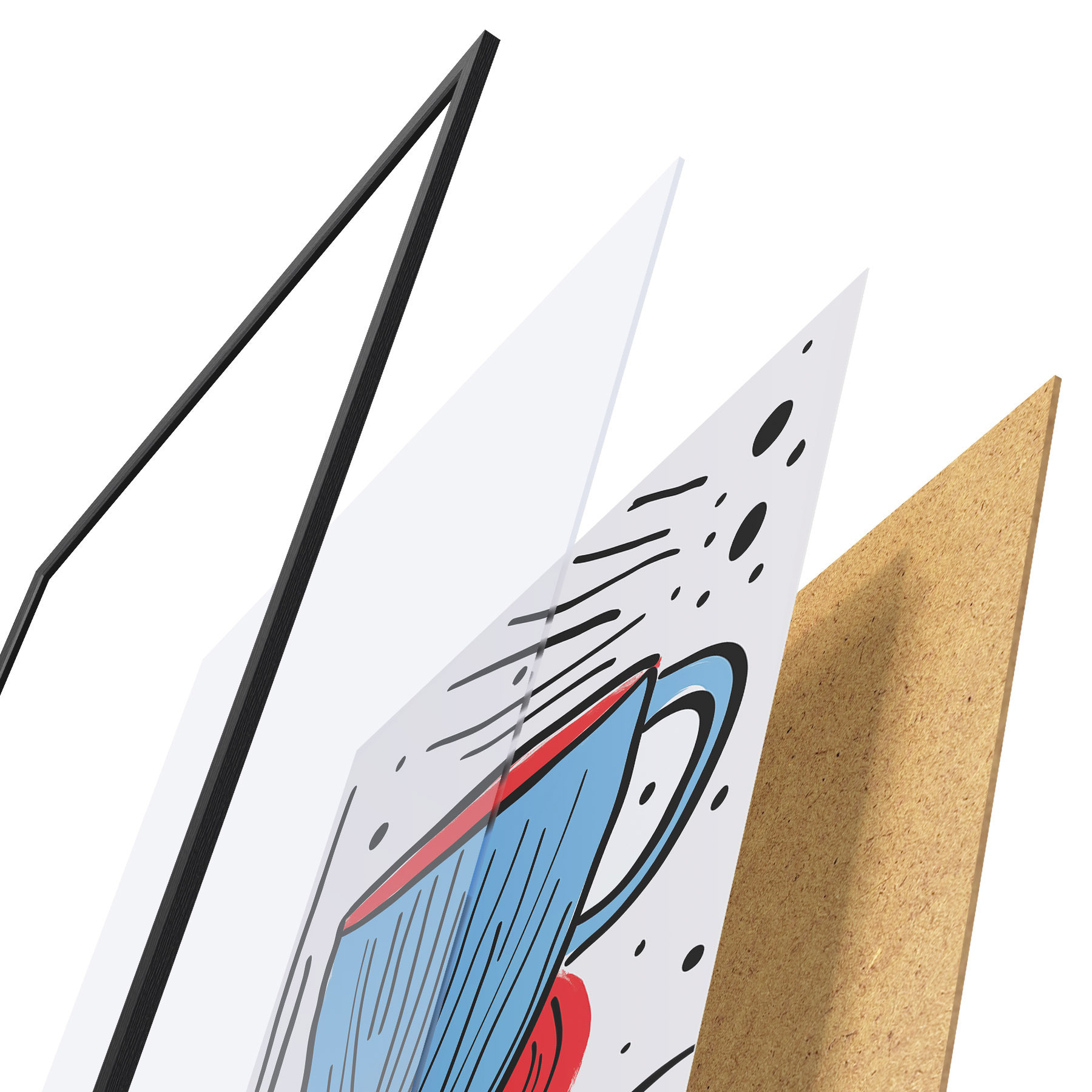 De poster bestaat uit een frame, plexiglas, geprinte afbeelding en spaanplaat achterkant. De poster kan meteen aan de muur worden gehangen dankzij de bevestigingen op de achterkant.