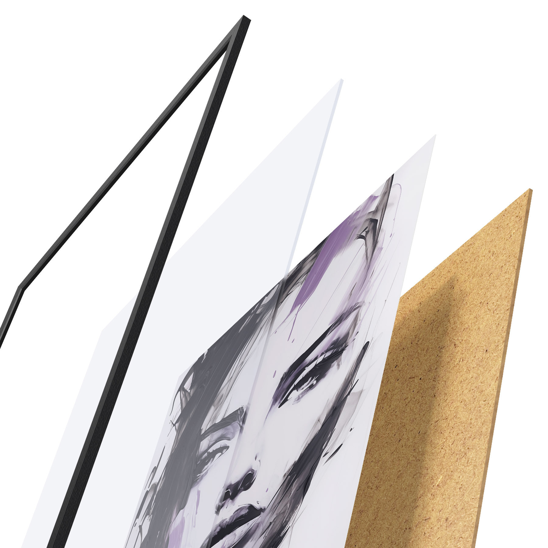 De poster bestaat uit een frame, plexiglas, geprinte afbeelding en spaanplaat achterkant. De poster kan meteen aan de muur worden gehangen dankzij de bevestigingen op de achterkant.