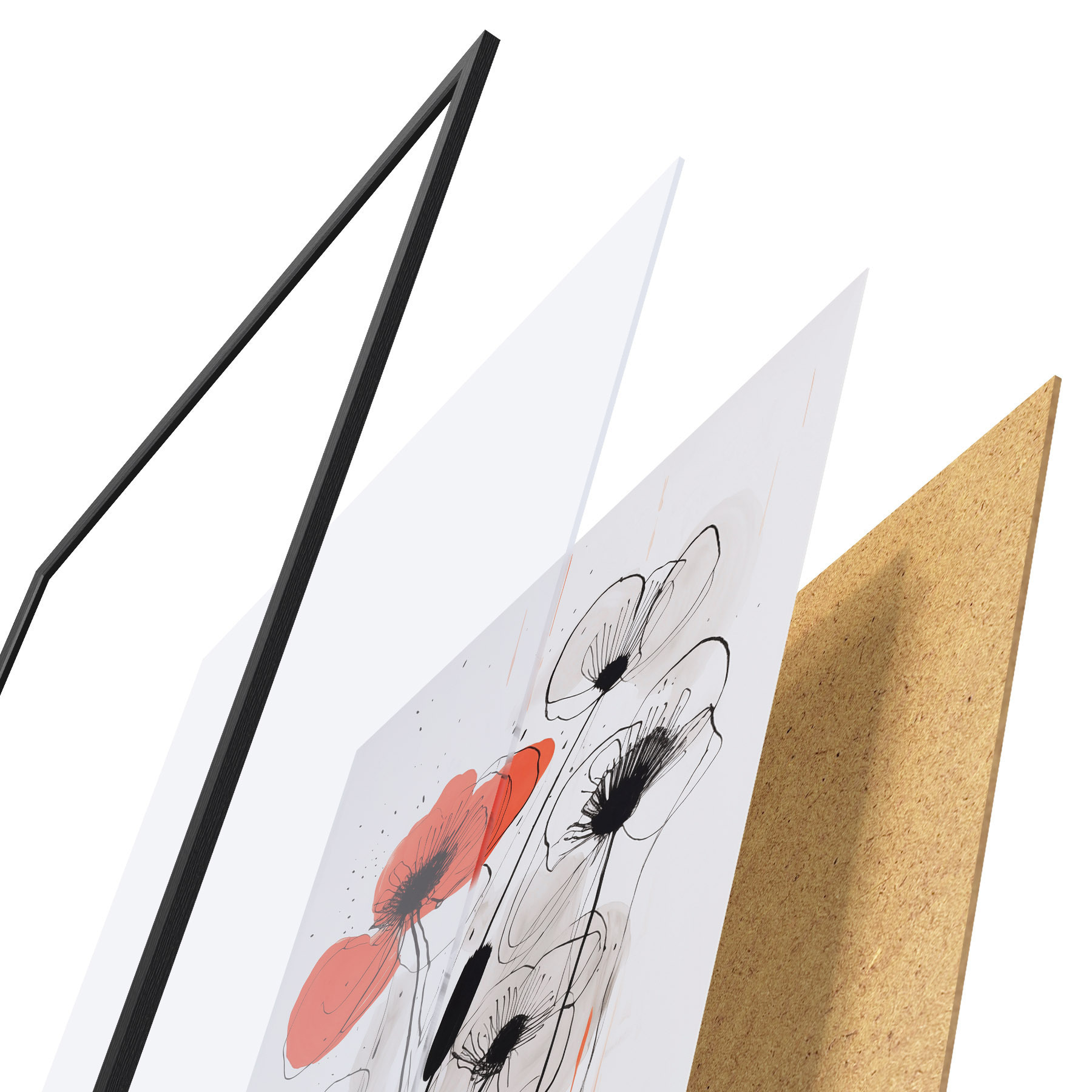 De poster bestaat uit een frame, plexiglas, geprinte afbeelding en spaanplaat achterkant. De poster kan meteen aan de muur worden gehangen dankzij de bevestigingen op de achterkant.