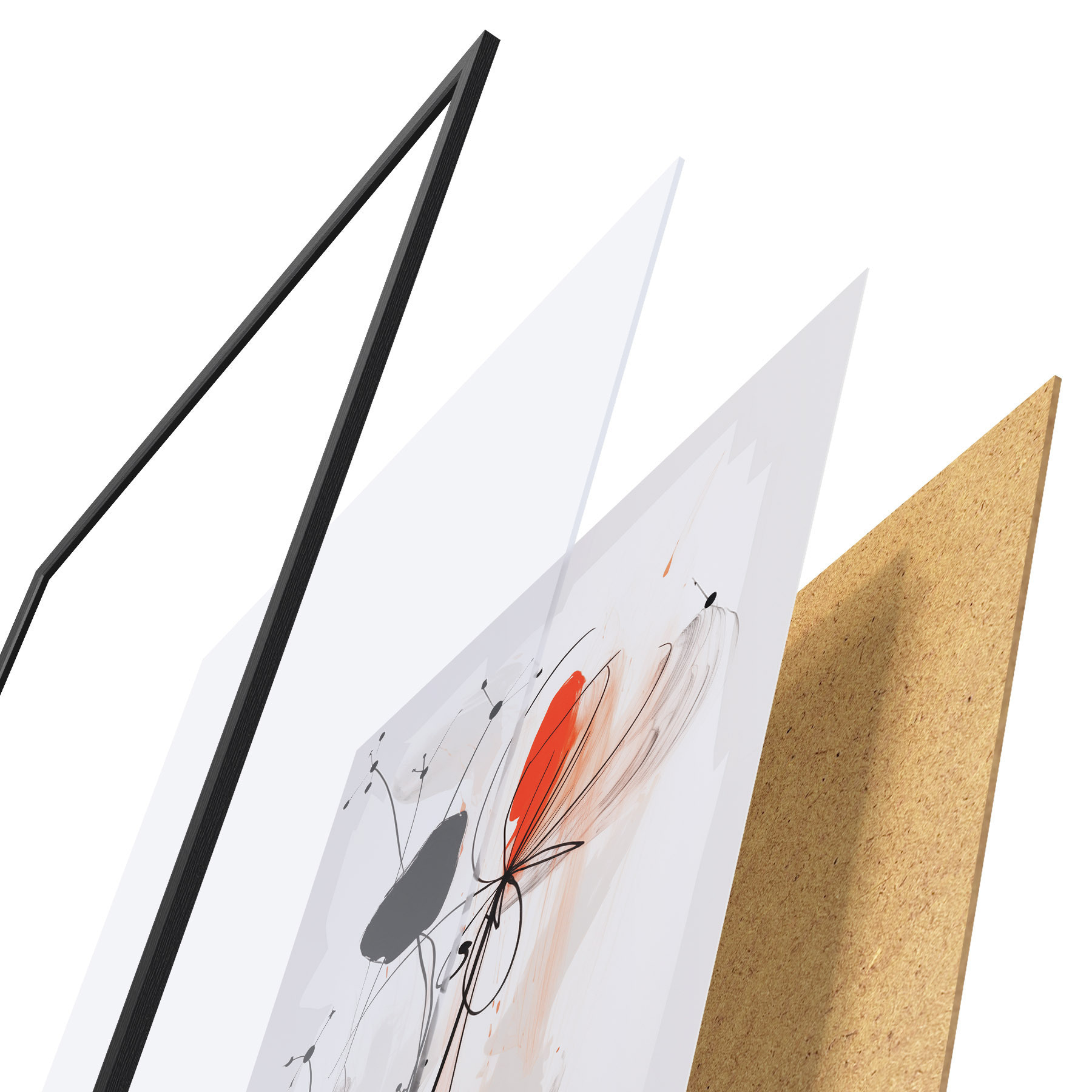 De poster bestaat uit een frame, plexiglas, geprinte afbeelding en spaanplaat achterkant. De poster kan meteen aan de muur worden gehangen dankzij de bevestigingen op de achterkant.