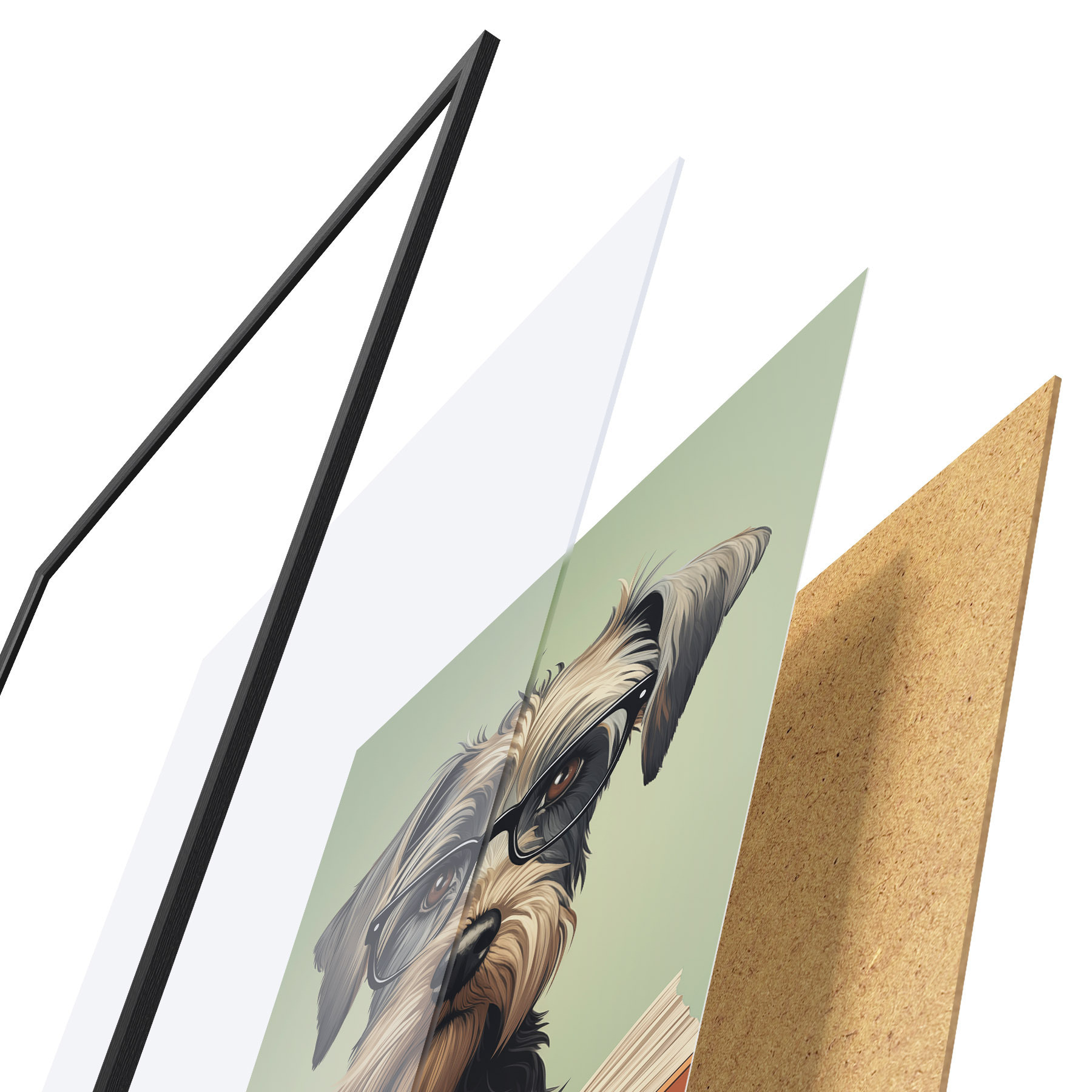 De poster bestaat uit een frame, plexiglas, geprinte afbeelding en spaanplaat achterkant. De poster kan meteen aan de muur worden gehangen dankzij de bevestigingen op de achterkant.