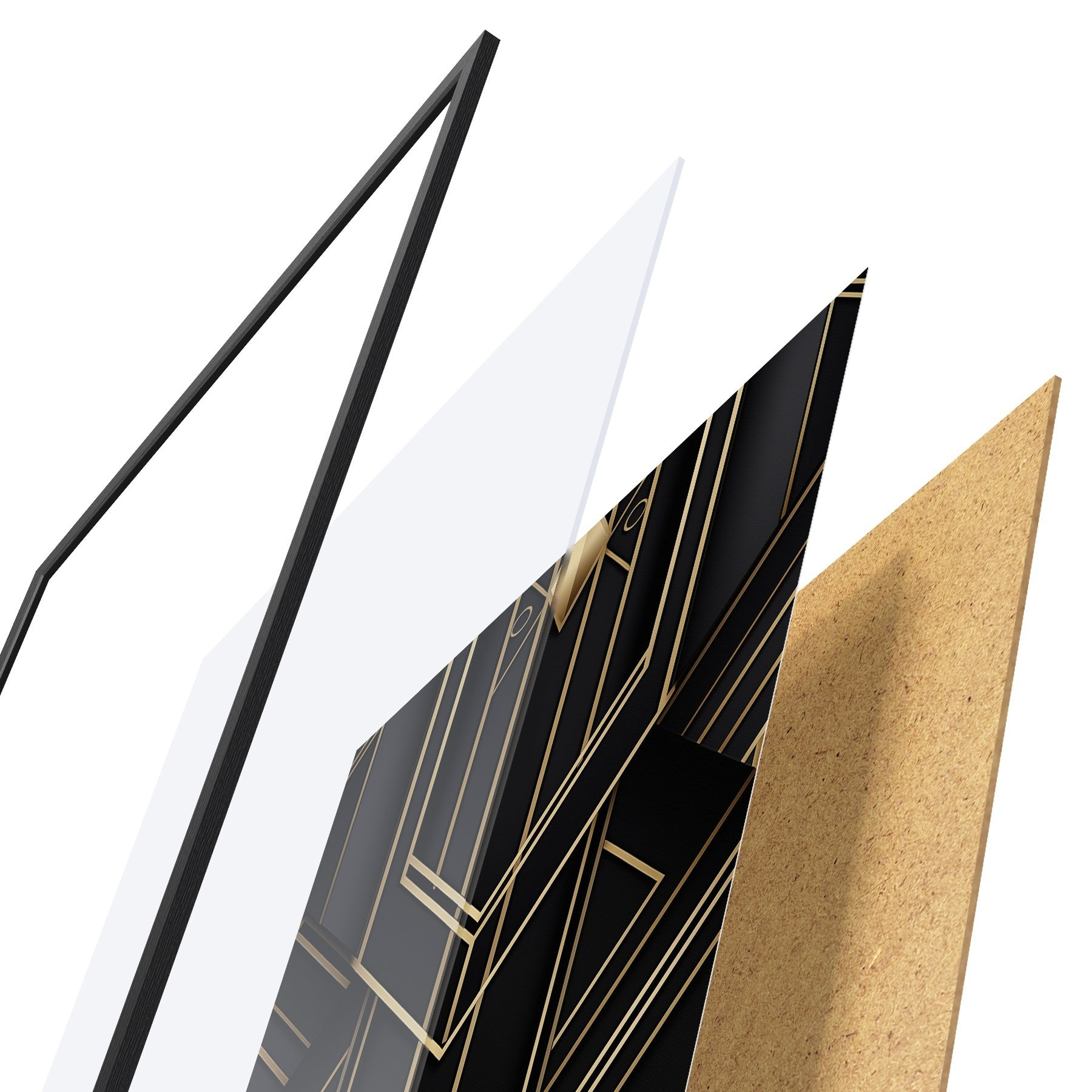 De poster bestaat uit een frame, plexiglas, geprinte afbeelding en spaanplaat achterkant. De poster kan meteen aan de muur worden gehangen dankzij de bevestigingen op de achterkant.