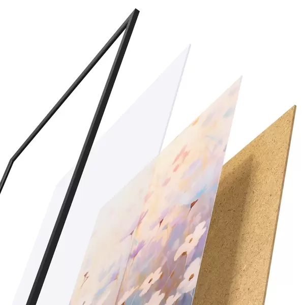 De poster bestaat uit een frame, plexiglas, geprinte afbeelding en spaanplaat achterkant. De poster kan meteen aan de muur worden gehangen dankzij de bevestigingen op de achterkant.