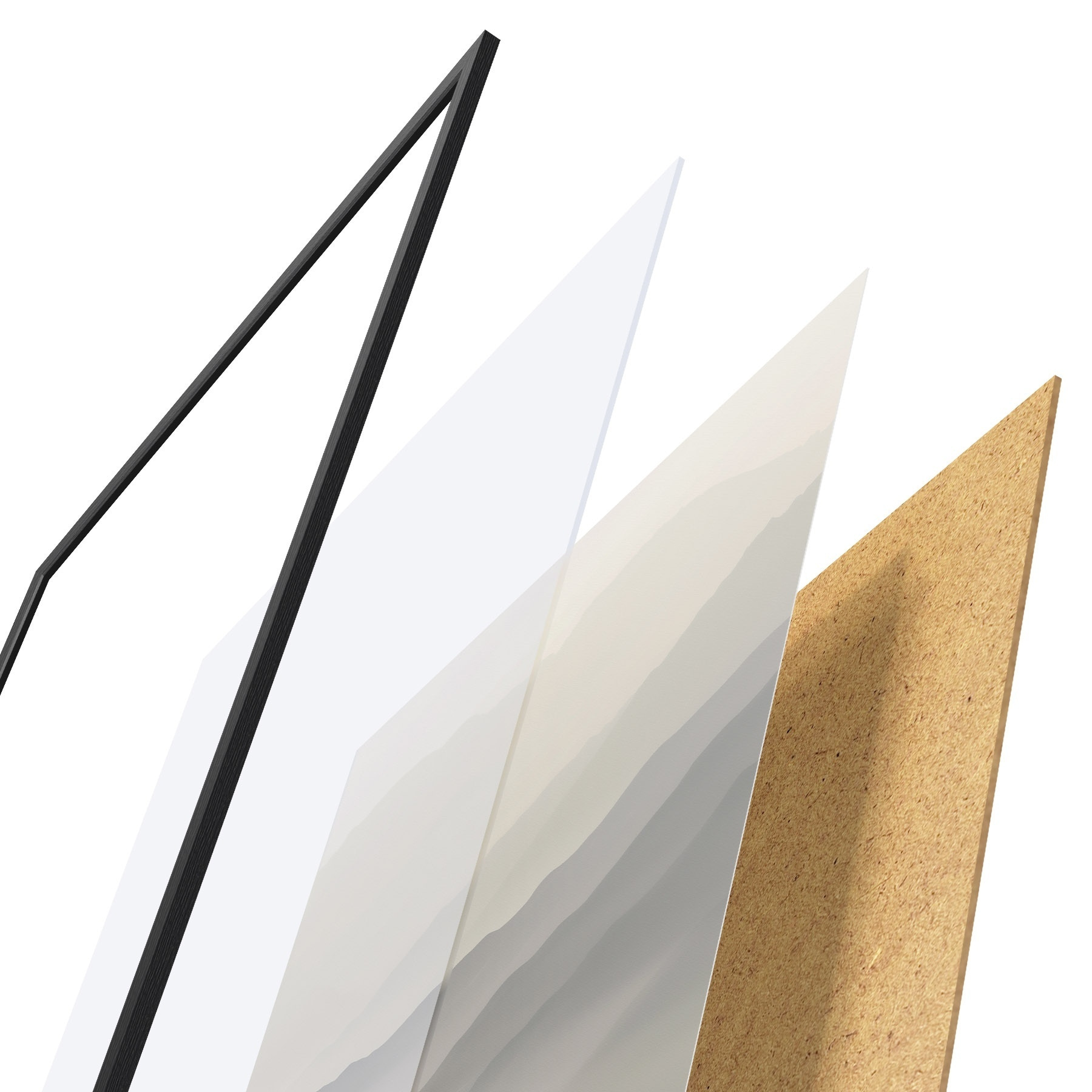 De poster bestaat uit een frame, plexiglas, geprinte afbeelding en spaanplaat achterkant. De poster kan meteen aan de muur worden gehangen dankzij de bevestigingen op de achterkant.