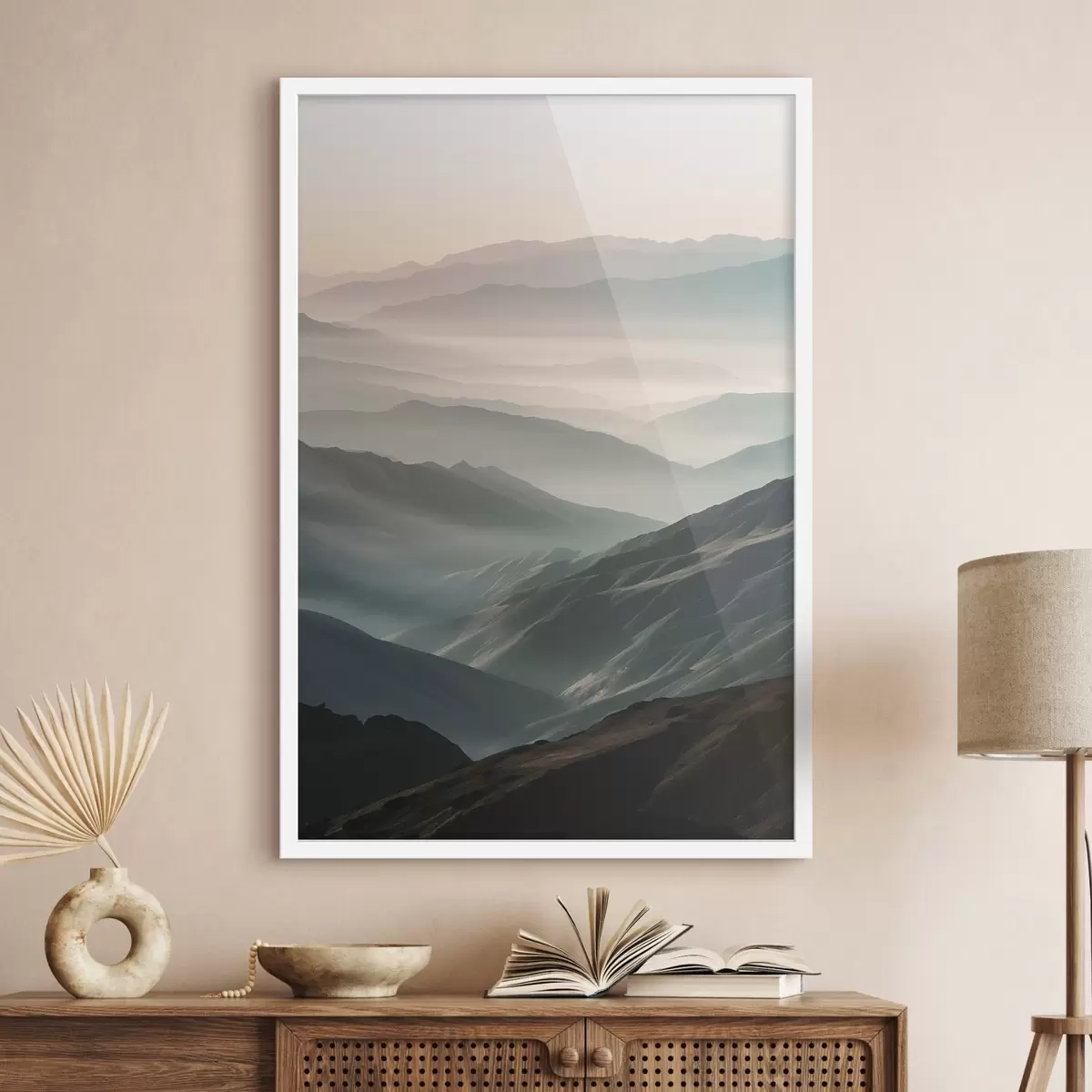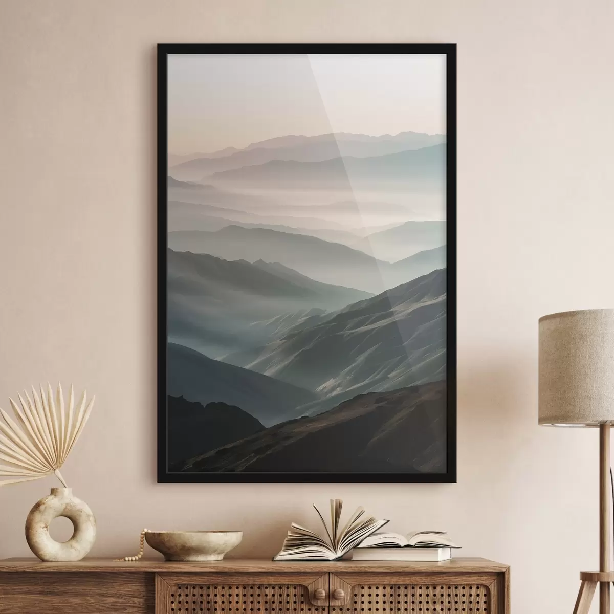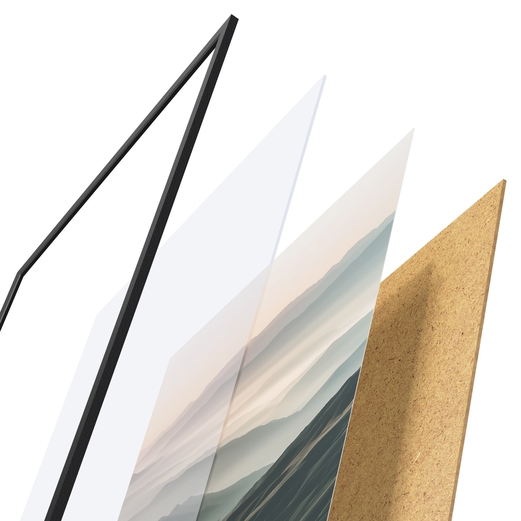 De poster bestaat uit een frame, plexiglas, geprinte afbeelding en spaanplaat achterkant. De poster kan meteen aan de muur worden gehangen dankzij de bevestigingen op de achterkant.