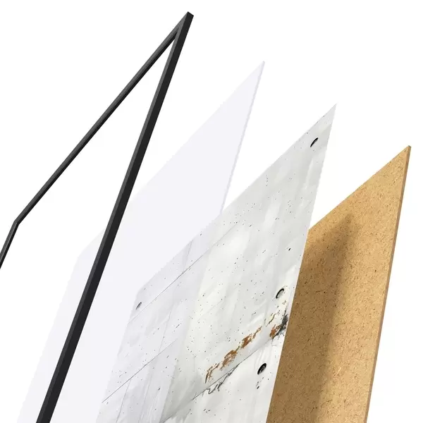 De poster bestaat uit een frame, plexiglas, geprinte afbeelding en spaanplaat achterkant. De poster kan meteen aan de muur worden gehangen dankzij de bevestigingen op de achterkant.