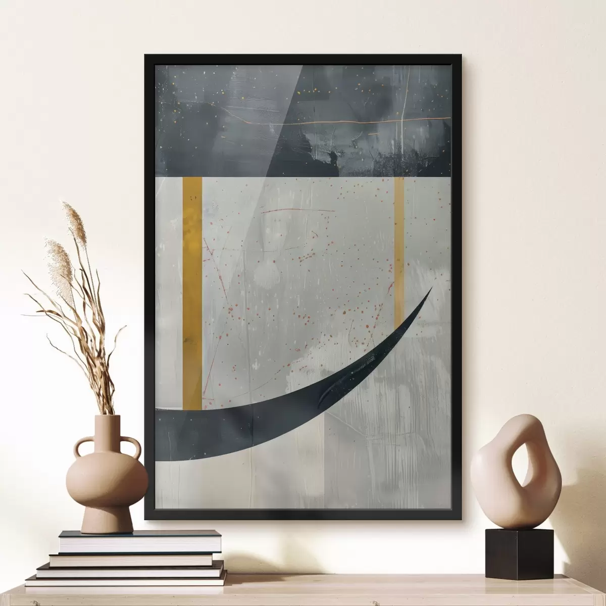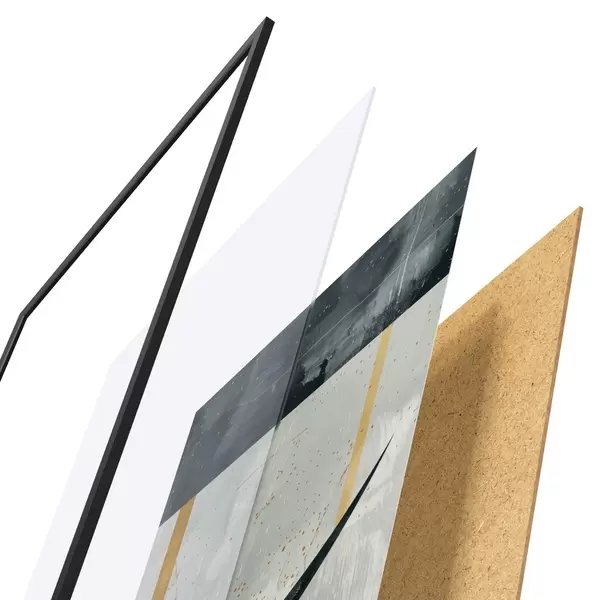 De poster bestaat uit een frame, plexiglas, geprinte afbeelding en spaanplaat achterkant. De poster kan meteen aan de muur worden gehangen dankzij de bevestigingen op de achterkant.