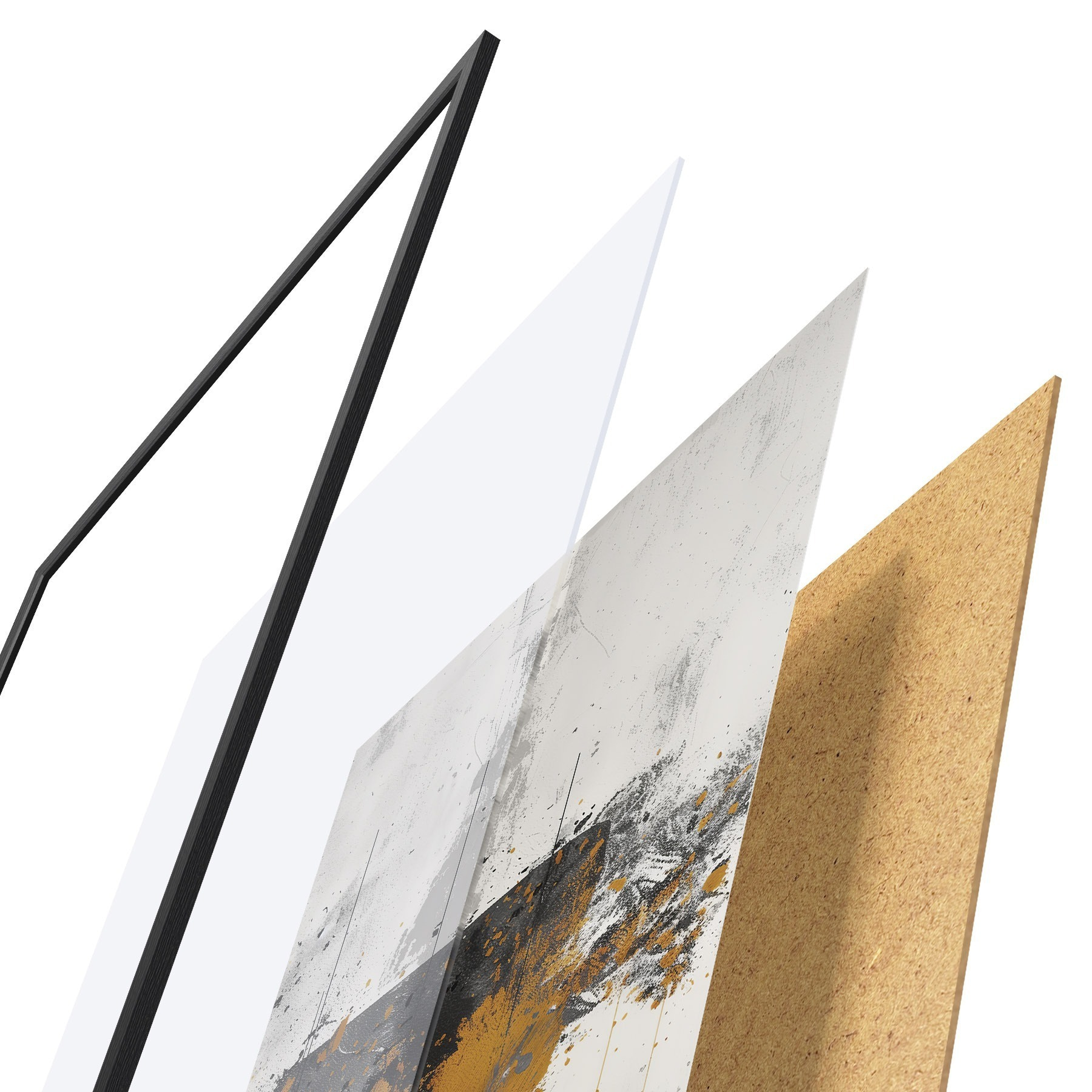 De poster bestaat uit een frame, plexiglas, geprinte afbeelding en spaanplaat achterkant. De poster kan meteen aan de muur worden gehangen dankzij de bevestigingen op de achterkant.