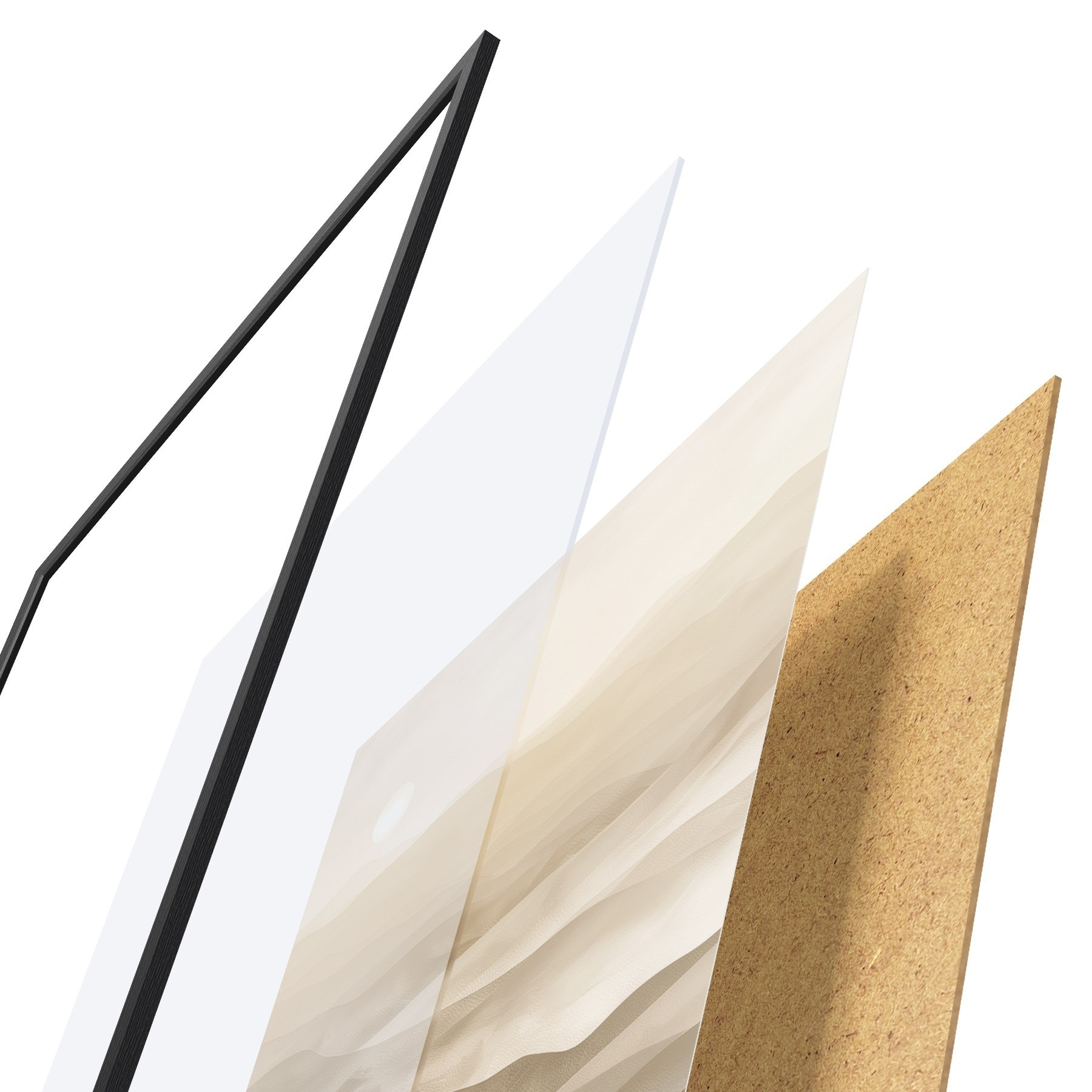 De poster bestaat uit een frame, plexiglas, geprinte afbeelding en spaanplaat achterkant. De poster kan meteen aan de muur worden gehangen dankzij de bevestigingen op de achterkant.