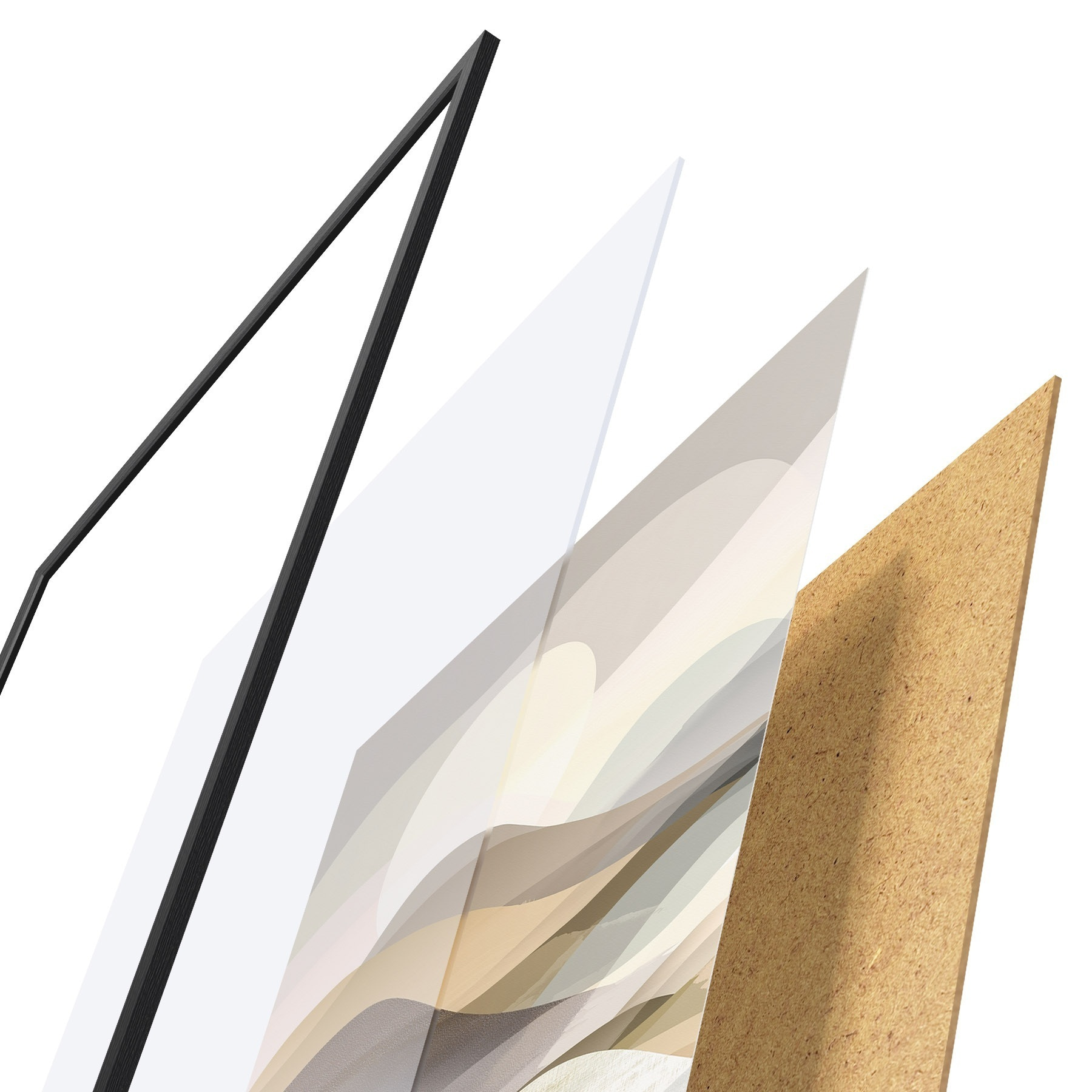 De poster bestaat uit een frame, plexiglas, geprinte afbeelding en spaanplaat achterkant. De poster kan meteen aan de muur worden gehangen dankzij de bevestigingen op de achterkant.