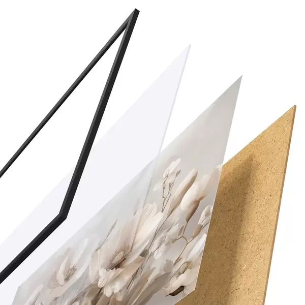 De poster bestaat uit een frame, plexiglas, geprinte afbeelding en spaanplaat achterkant. De poster kan meteen aan de muur worden gehangen dankzij de bevestigingen op de achterkant.