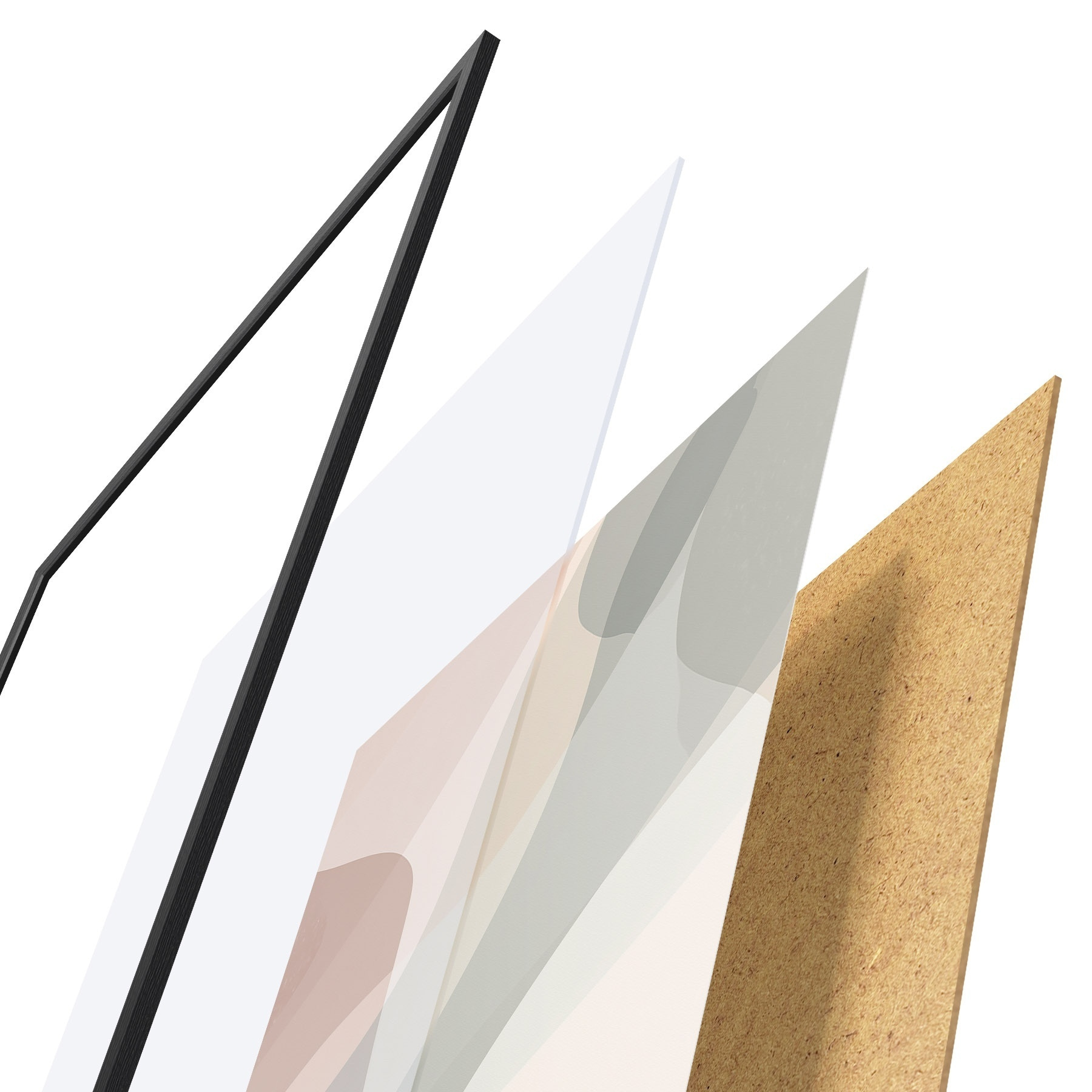 De poster bestaat uit een frame, plexiglas, geprinte afbeelding en spaanplaat achterkant. De poster kan meteen aan de muur worden gehangen dankzij de bevestigingen op de achterkant.