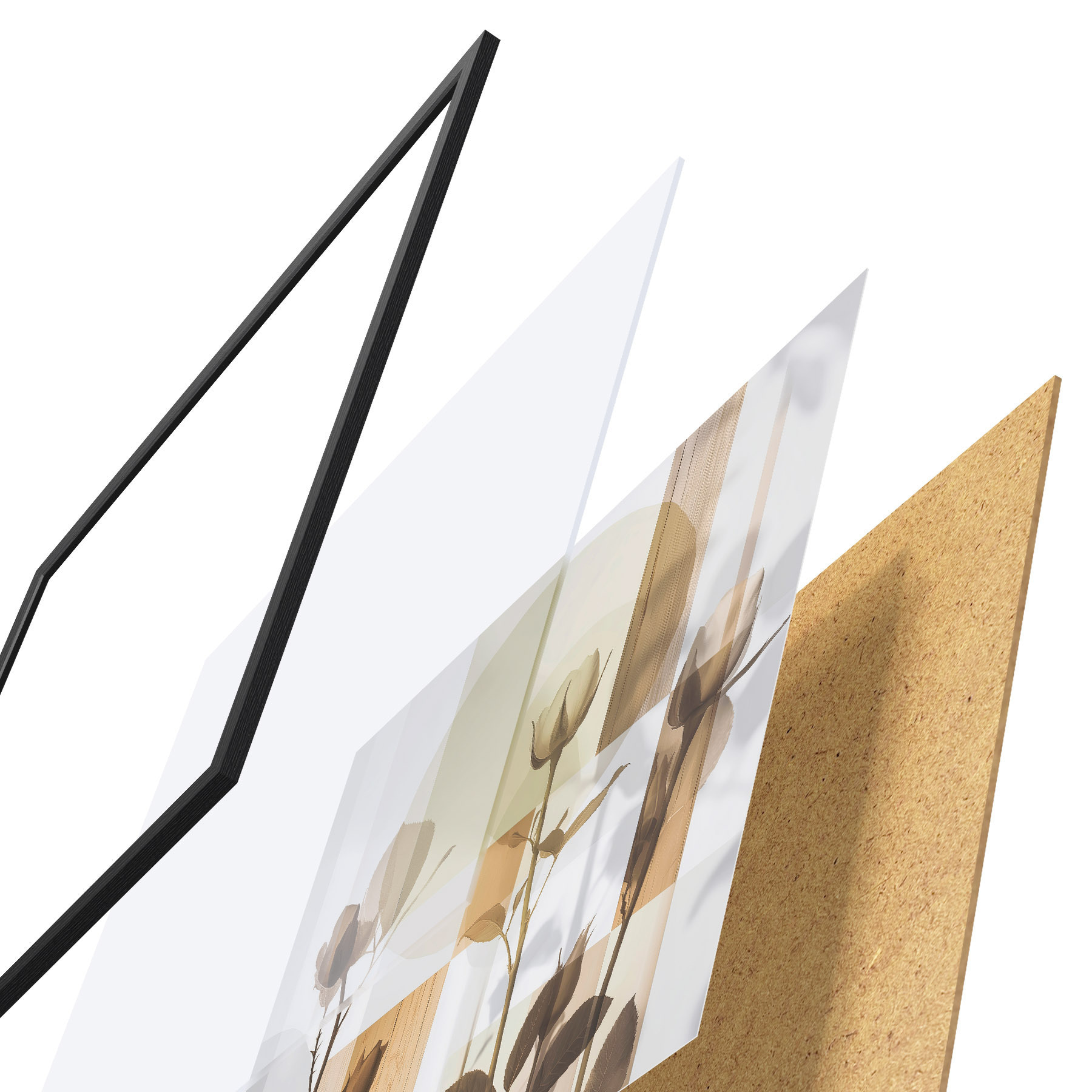 De poster bestaat uit een frame, plexiglas, geprinte afbeelding en spaanplaat achterkant. De poster kan meteen aan de muur worden gehangen dankzij de bevestigingen op de achterkant.