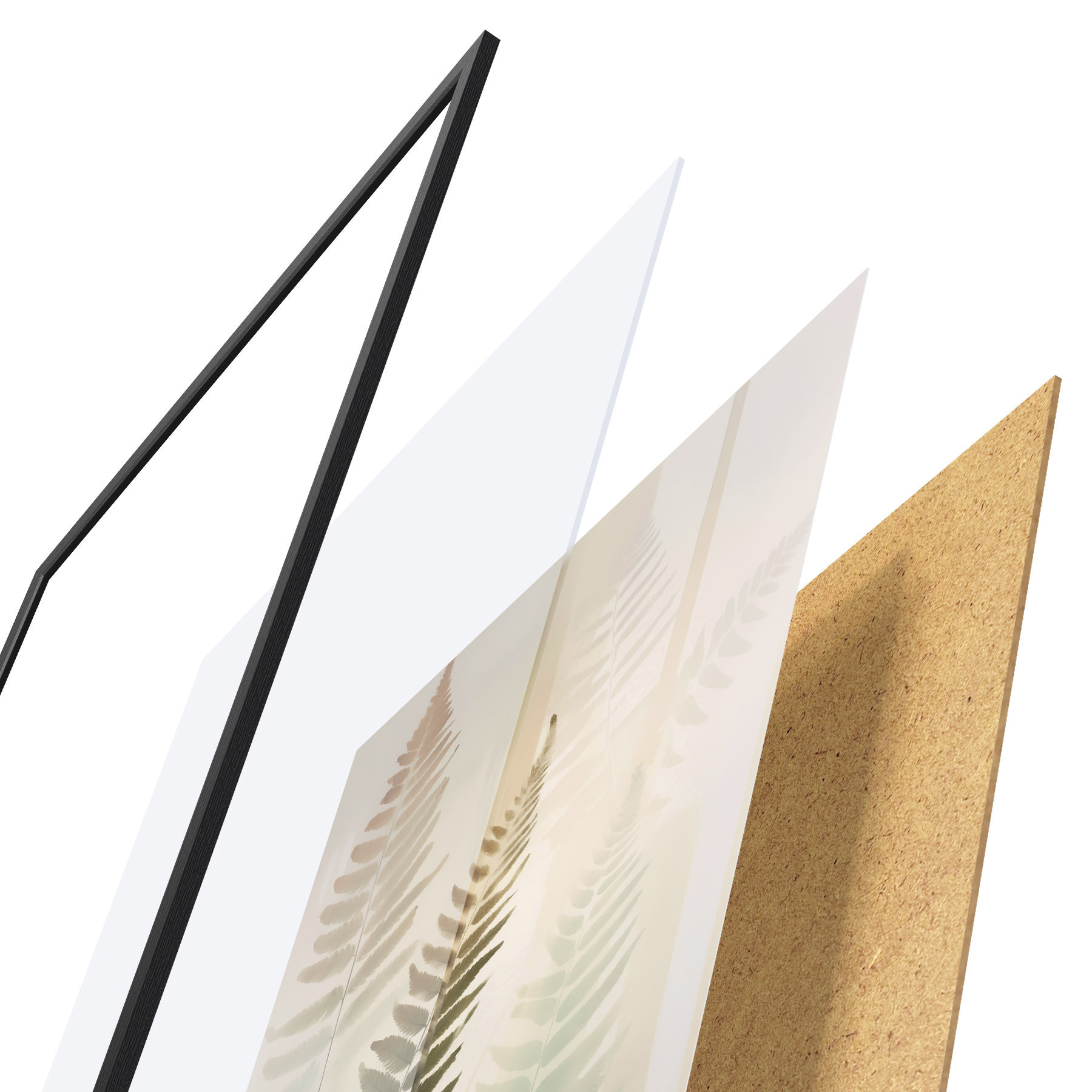 De poster bestaat uit een frame, plexiglas, geprinte afbeelding en spaanplaat achterkant. De poster kan meteen aan de muur worden gehangen dankzij de bevestigingen op de achterkant.