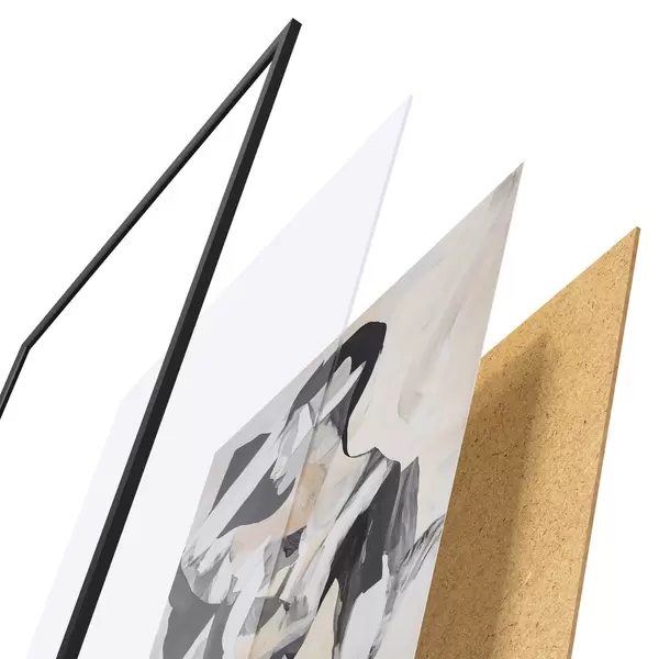 De poster bestaat uit een frame, plexiglas, geprinte afbeelding en spaanplaat achterkant. De poster kan meteen aan de muur worden gehangen dankzij de bevestigingen op de achterkant.