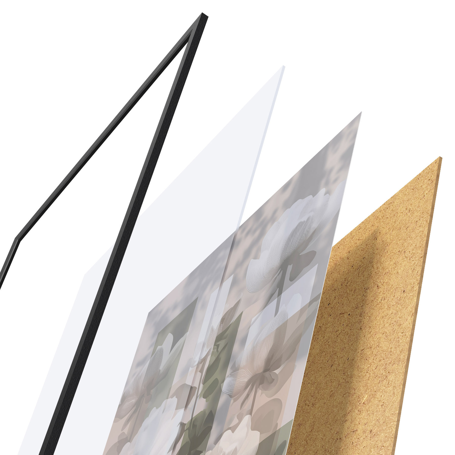 De poster bestaat uit een frame, plexiglas, geprinte afbeelding en spaanplaat achterkant. De poster kan meteen aan de muur worden gehangen dankzij de bevestigingen op de achterkant.