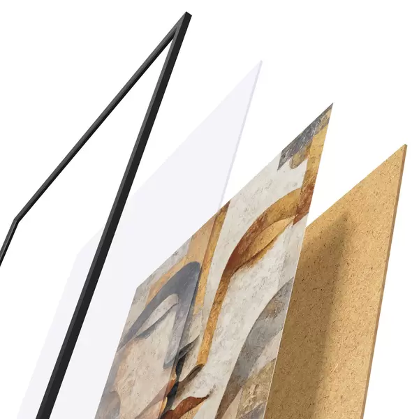 De poster bestaat uit een frame, plexiglas, geprinte afbeelding en spaanplaat achterkant. De poster kan meteen aan de muur worden gehangen dankzij de bevestigingen op de achterkant.