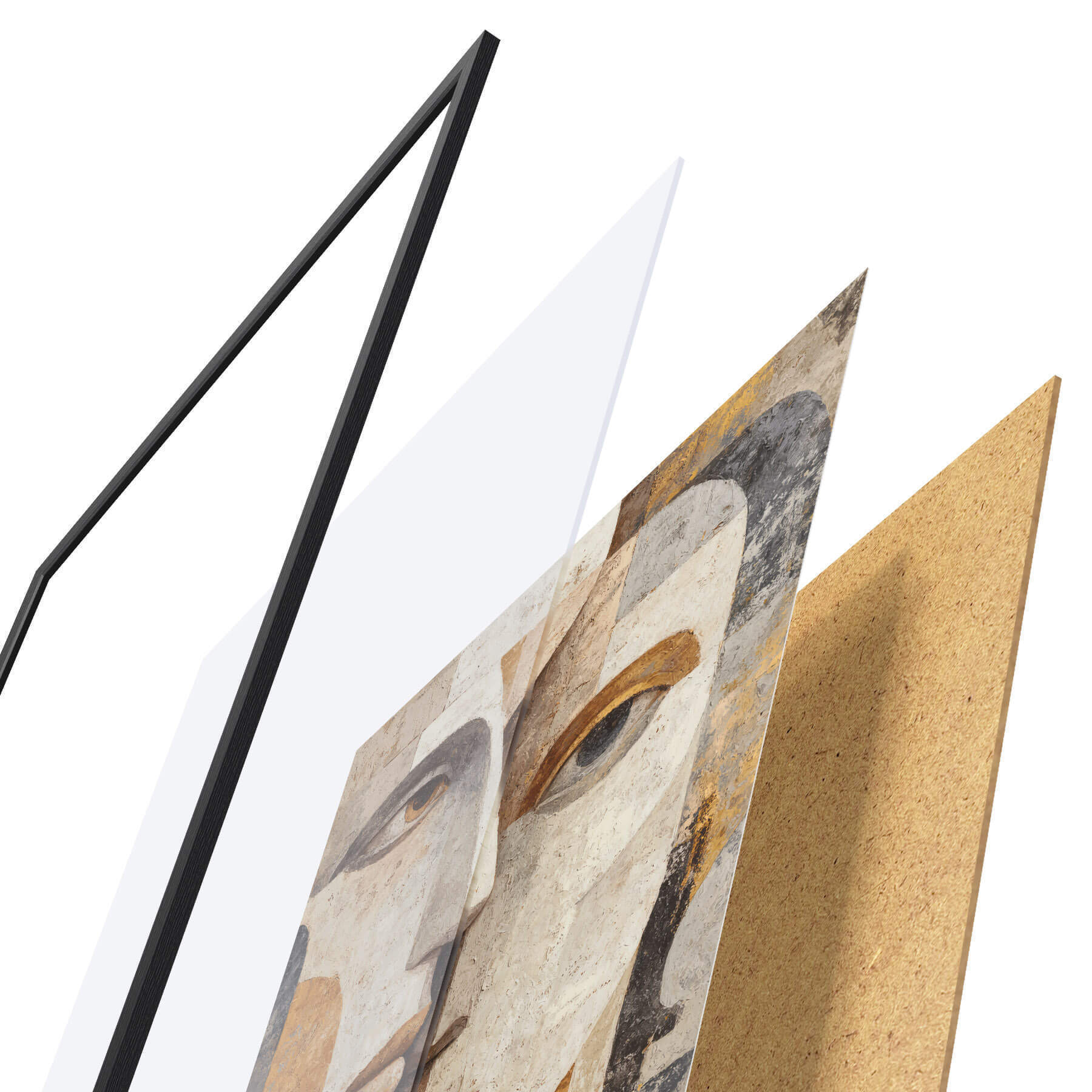 De poster bestaat uit een frame, plexiglas, geprinte afbeelding en spaanplaat achterkant. De poster kan meteen aan de muur worden gehangen dankzij de bevestigingen op de achterkant.