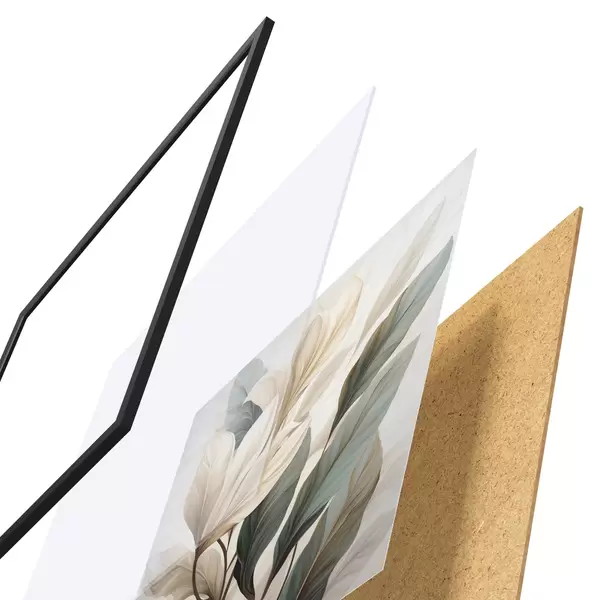 De poster bestaat uit een frame, plexiglas, geprinte afbeelding en spaanplaat achterkant. De poster kan meteen aan de muur worden gehangen dankzij de bevestigingen op de achterkant.