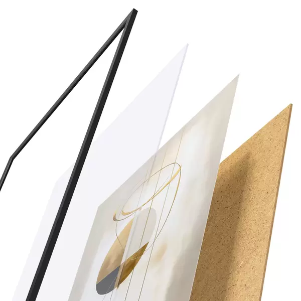 De poster bestaat uit een frame, plexiglas, geprinte afbeelding en spaanplaat achterkant. De poster kan meteen aan de muur worden gehangen dankzij de bevestigingen op de achterkant.