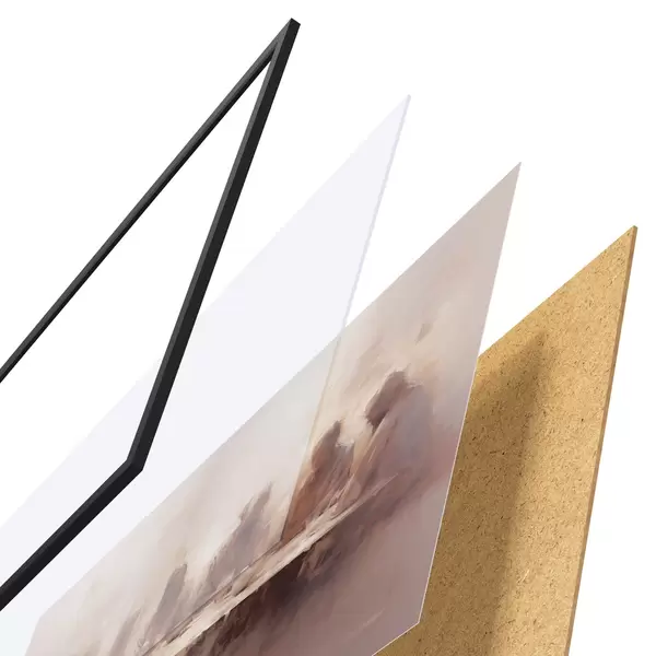 De poster bestaat uit een frame, plexiglas, geprinte afbeelding en spaanplaat achterkant. De poster kan meteen aan de muur worden gehangen dankzij de bevestigingen op de achterkant.
