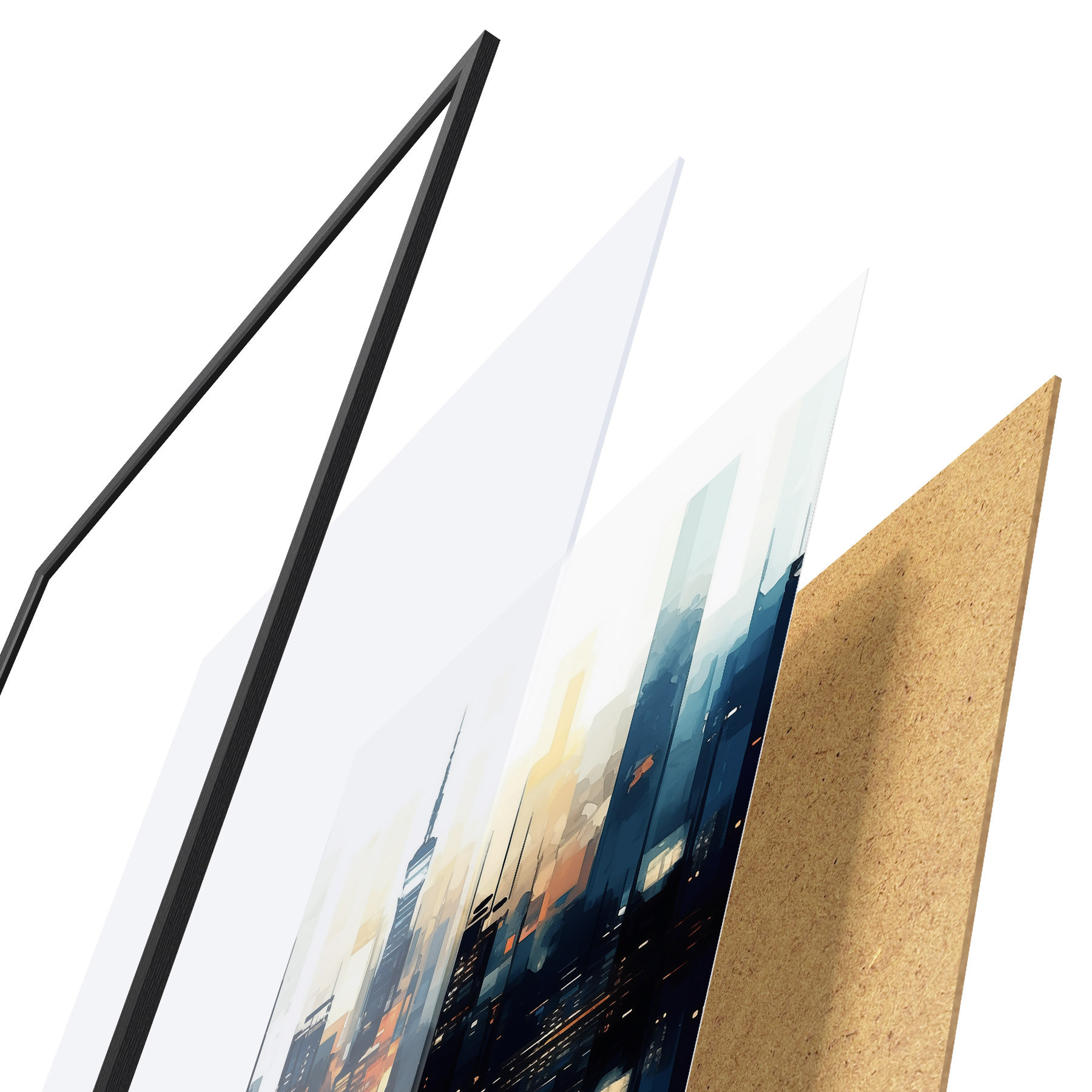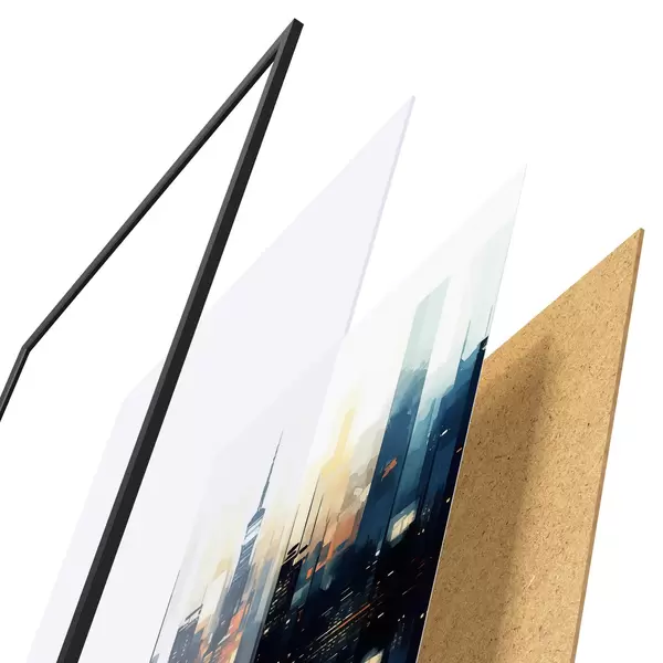 De poster bestaat uit een frame, plexiglas, geprinte afbeelding en spaanplaat achterkant. De poster kan meteen aan de muur worden gehangen dankzij de bevestigingen op de achterkant.