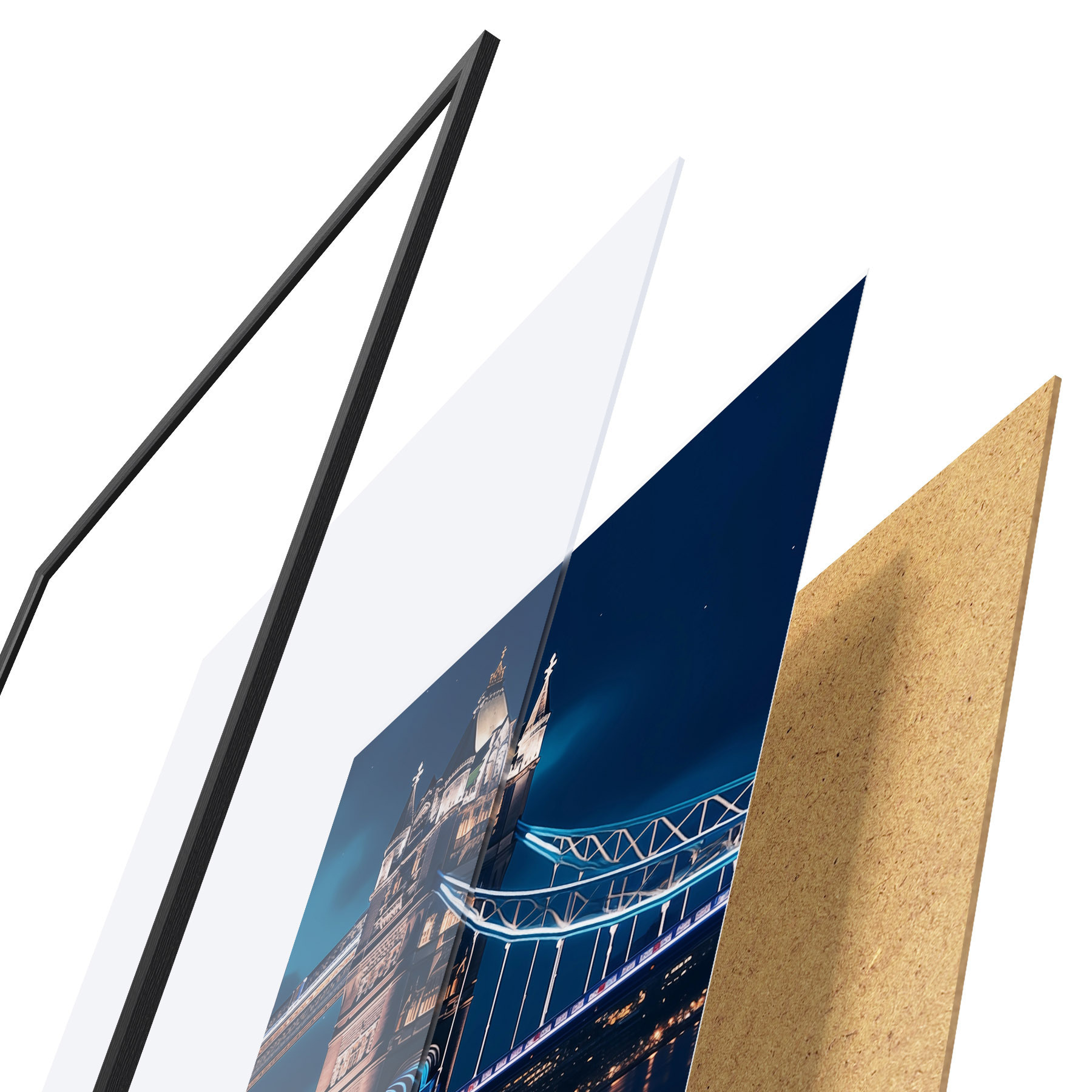 De poster bestaat uit een frame, plexiglas, geprinte afbeelding en spaanplaat achterkant. De poster kan meteen aan de muur worden gehangen dankzij de bevestigingen op de achterkant.