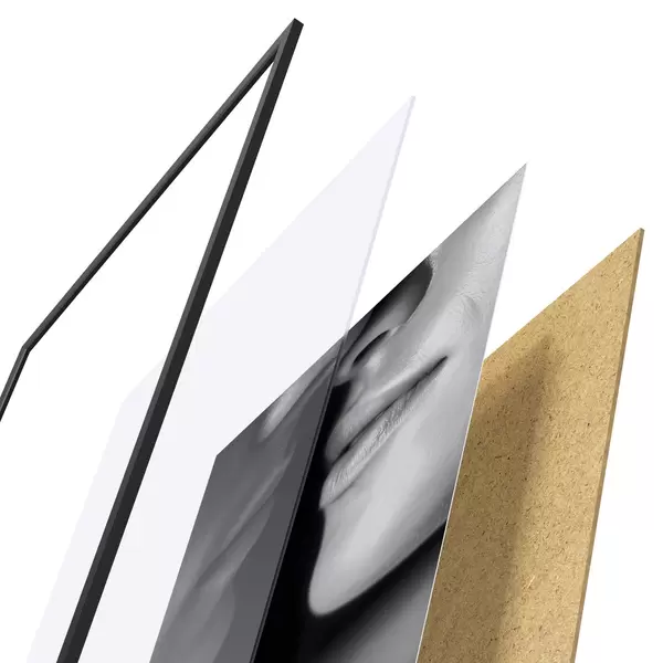 De poster bestaat uit een frame, plexiglas, geprinte afbeelding en spaanplaat achterkant. De poster kan meteen aan de muur worden gehangen dankzij de bevestigingen op de achterkant.