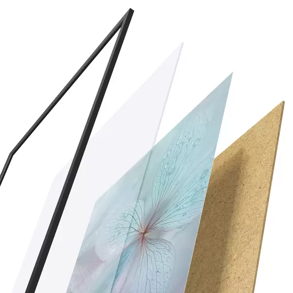 De poster bestaat uit een frame, plexiglas, geprinte afbeelding en spaanplaat achterkant. De poster kan meteen aan de muur worden gehangen dankzij de bevestigingen op de achterkant.