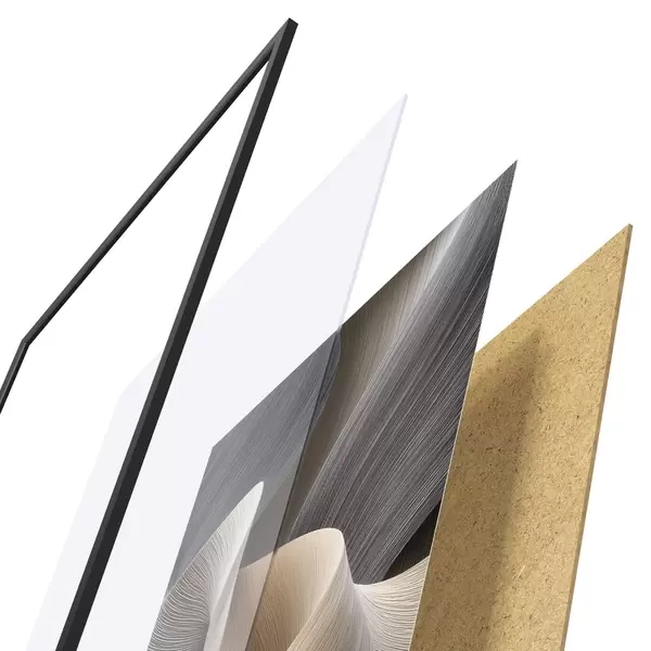 De poster bestaat uit een frame, plexiglas, geprinte afbeelding en spaanplaat achterkant. De poster kan meteen aan de muur worden gehangen dankzij de bevestigingen op de achterkant.