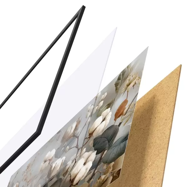 De poster bestaat uit een frame, plexiglas, geprinte afbeelding en spaanplaat achterkant. De poster kan meteen aan de muur worden gehangen dankzij de bevestigingen op de achterkant.