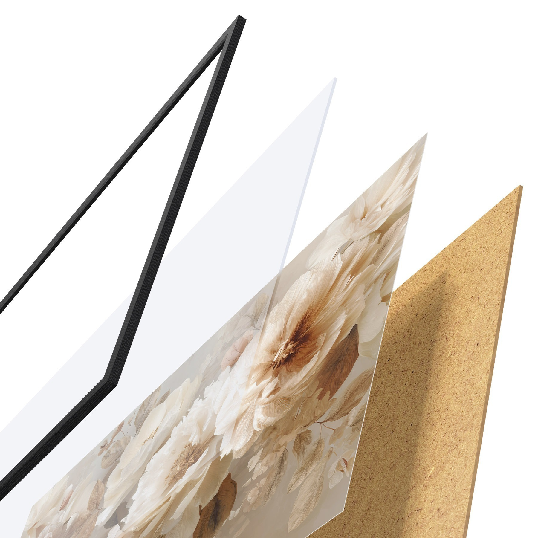 De poster bestaat uit een frame, plexiglas, geprinte afbeelding en spaanplaat achterkant. De poster kan meteen aan de muur worden gehangen dankzij de bevestigingen op de achterkant.